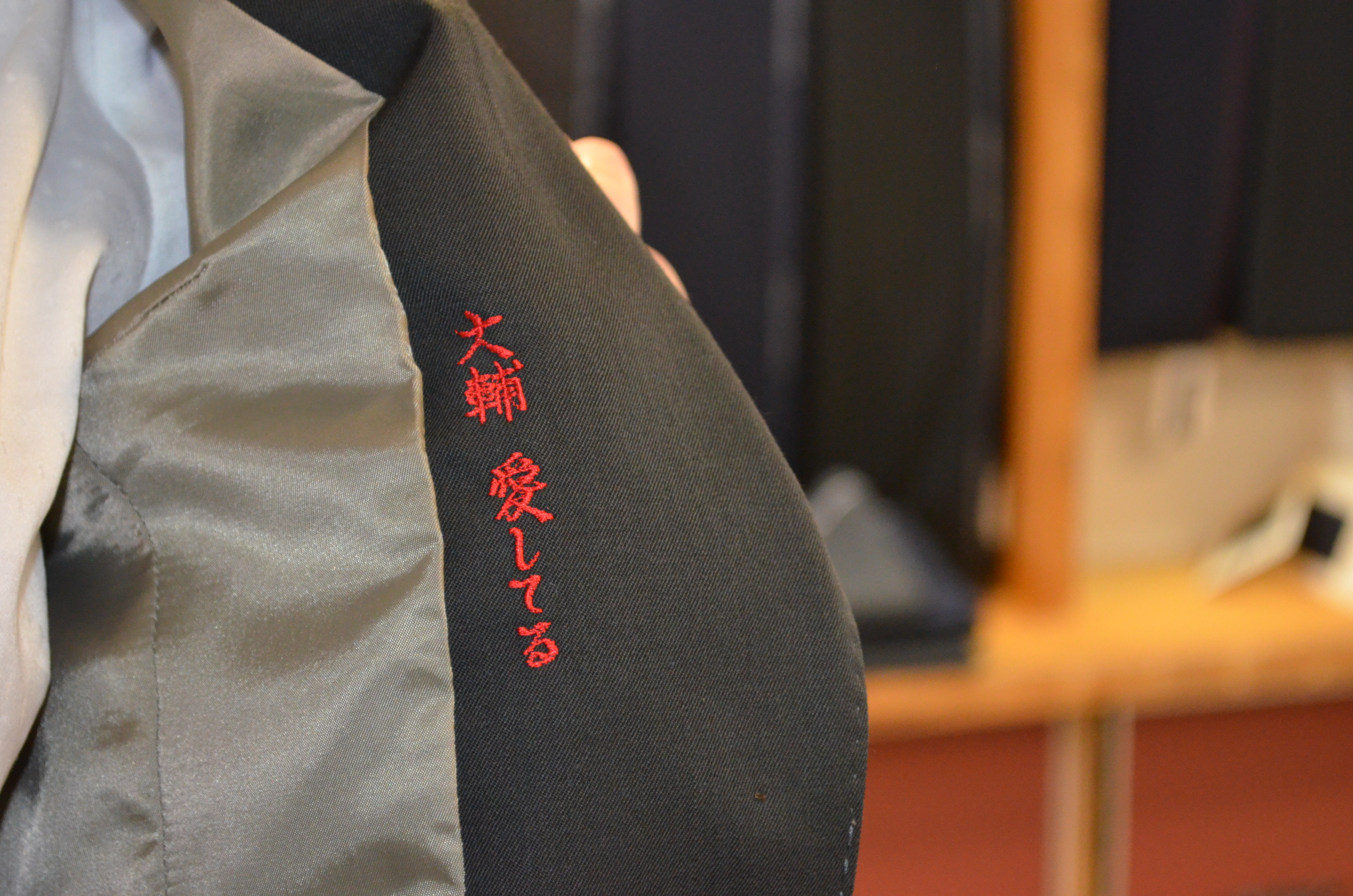 「めおとスーツ」は、「●●愛してる」や「絶対浮気はしません」など、夫婦の「誓いの言葉」(自由に設定可能)を赤い糸で刺繍したペアスーツです。夫婦揃って来店し、お互いにサイズを測りあっていただくことが購入の条件で、「誓いの言葉」入りスーツ2着を、1着分の金額(通常:税込 4万3,200円)でご購入いただけます(実質1着分無料)。