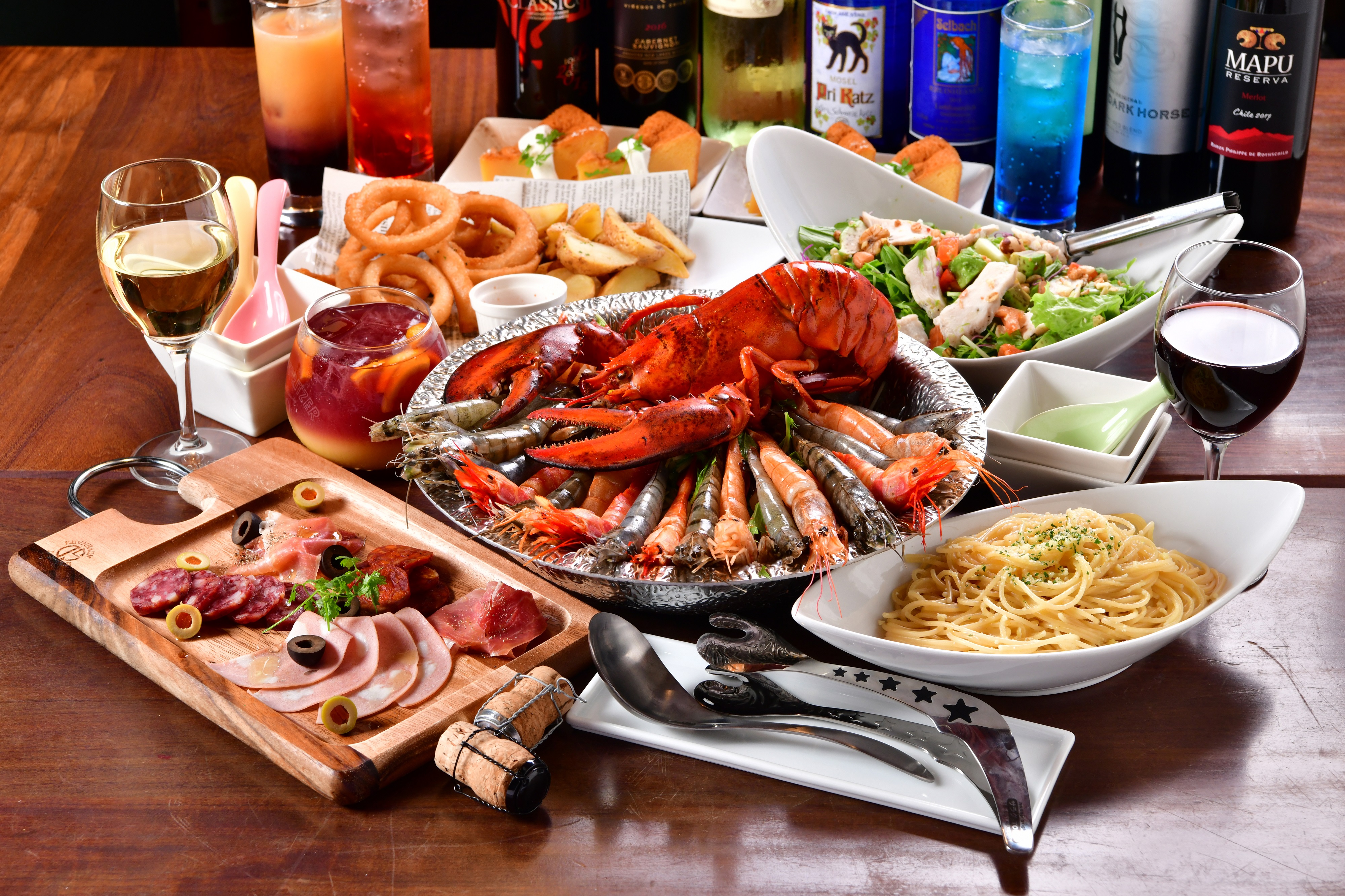 オニオンリングとポテトフライ/10種の海老鍋(活けオマールエビのつかみ取り付)/