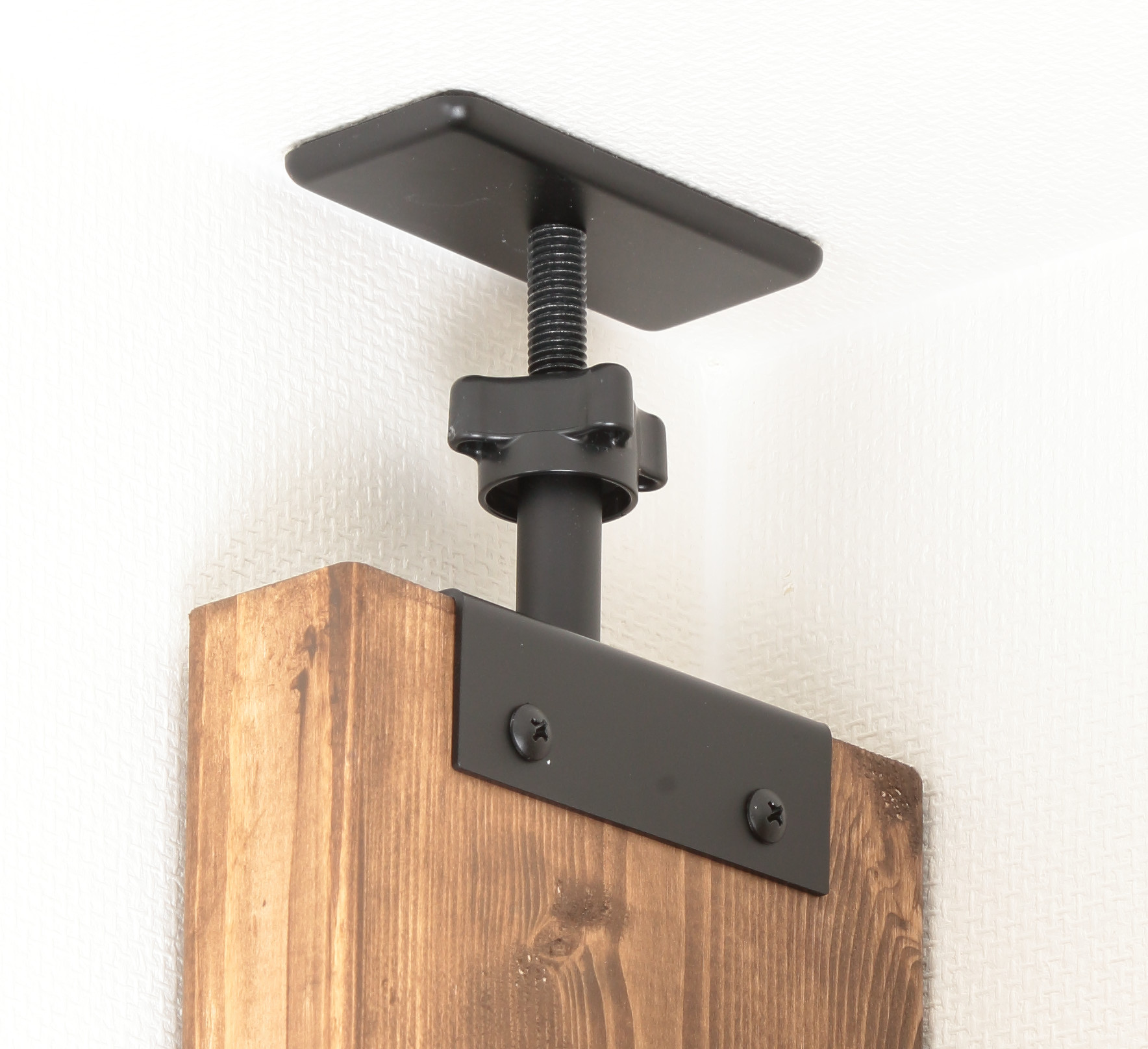 アジャスターはナットノブを回して締め込んでいくだけなので、DIY初心者でも簡単に取り付けることができます。アジャスター部分はバネ式なので、設置後の2×4材の多少の収縮にも対応。スチール製ならではの強度で安心感があります。