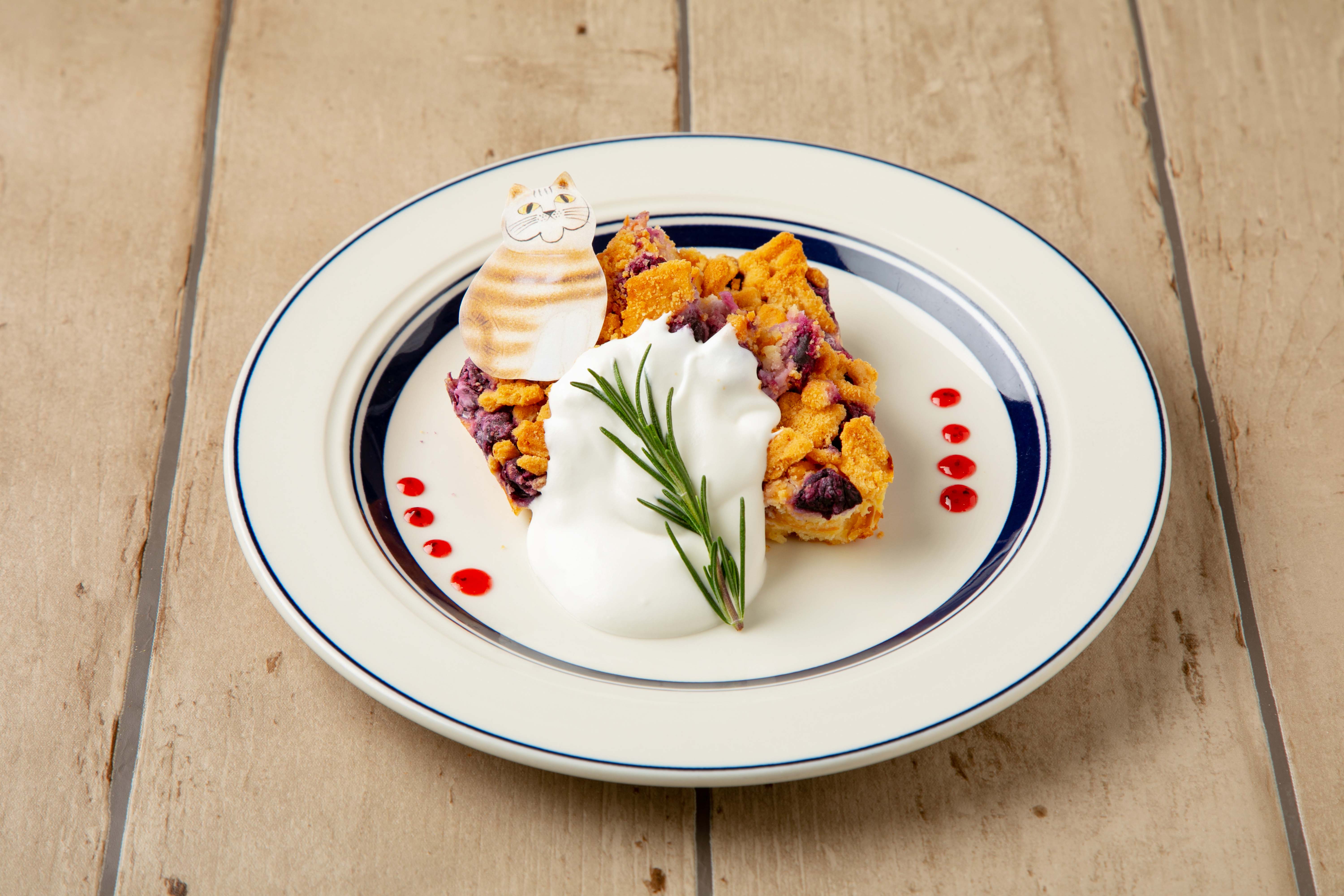 森で摘んで来たブルーベリーを使ってよく作られるブルーベリーケーキ。ヨーグルト風味のしっとりした生地に、ブルーベリーとクランブルを敷き詰め焼き上げました。モナカのミアと甘さ控えめのシャンティを添えて。