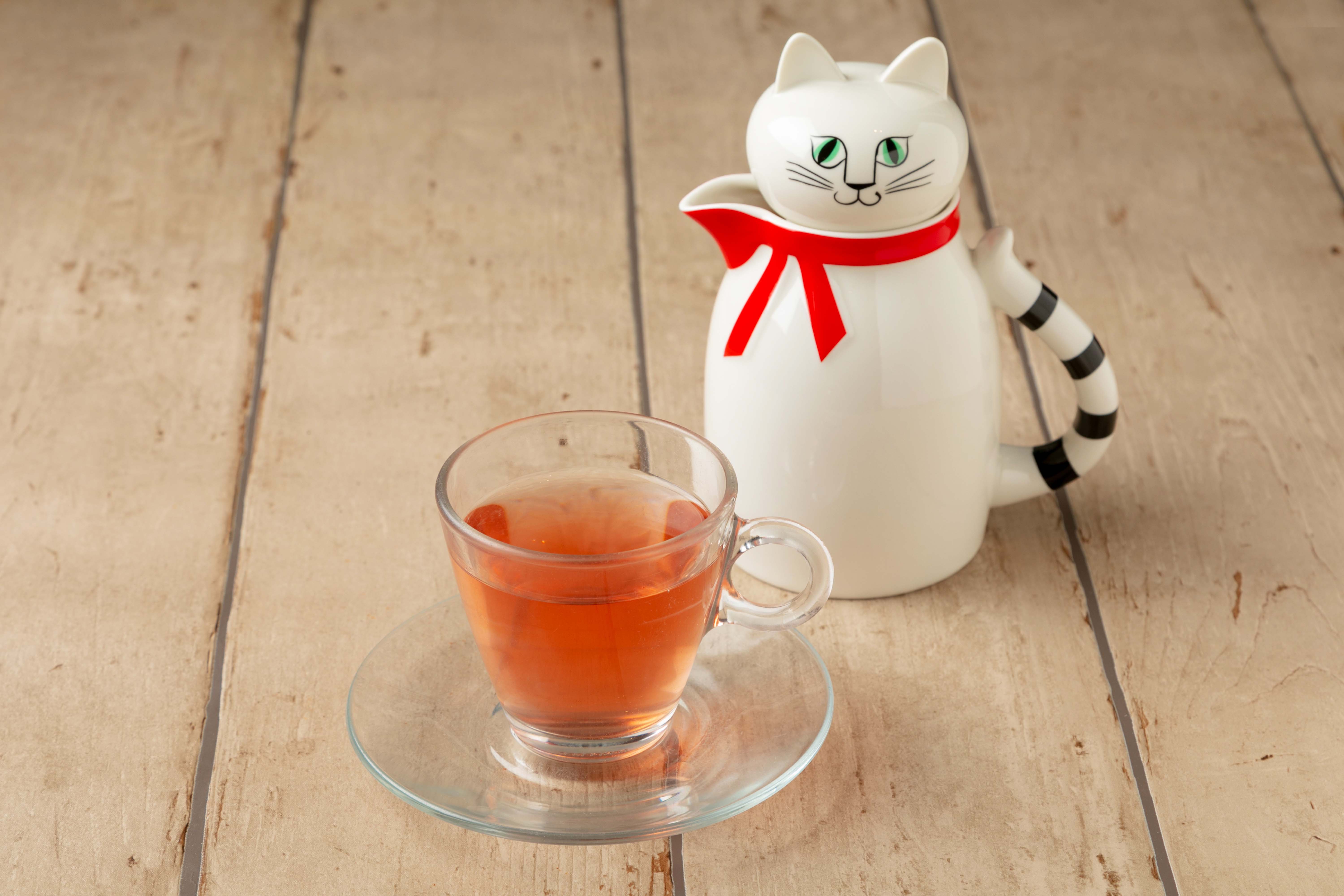 復刻版の人気グッズである猫の形のティーポット、白猫の「FIA(フィア)」は、ハーブティー。黒猫の「PIA(ピア)」は、フレーバーティーでご提供。