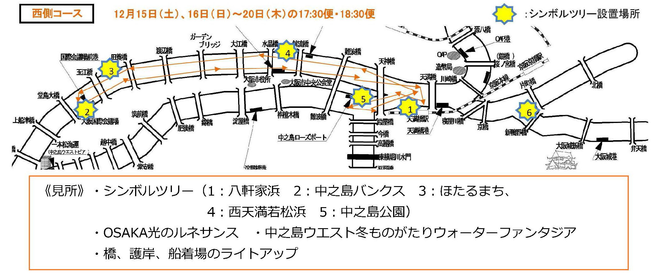 今年は6本目となるクリスマスツリーが大阪城からすぐの城見緑道公園に完成。ライトアップもスタートしました。この6本目のツリーを「光の中之島クルーズ」で今年初めて運航する「東側コース」でご覧いただけます。昨年ご好評いただきました「西側コース」も運航します。また、小型パーティボートでチャーター運航する「光の中之島クルーズ スペシャルバージョン」では、6本すべてのツリーをご覧いただけます。