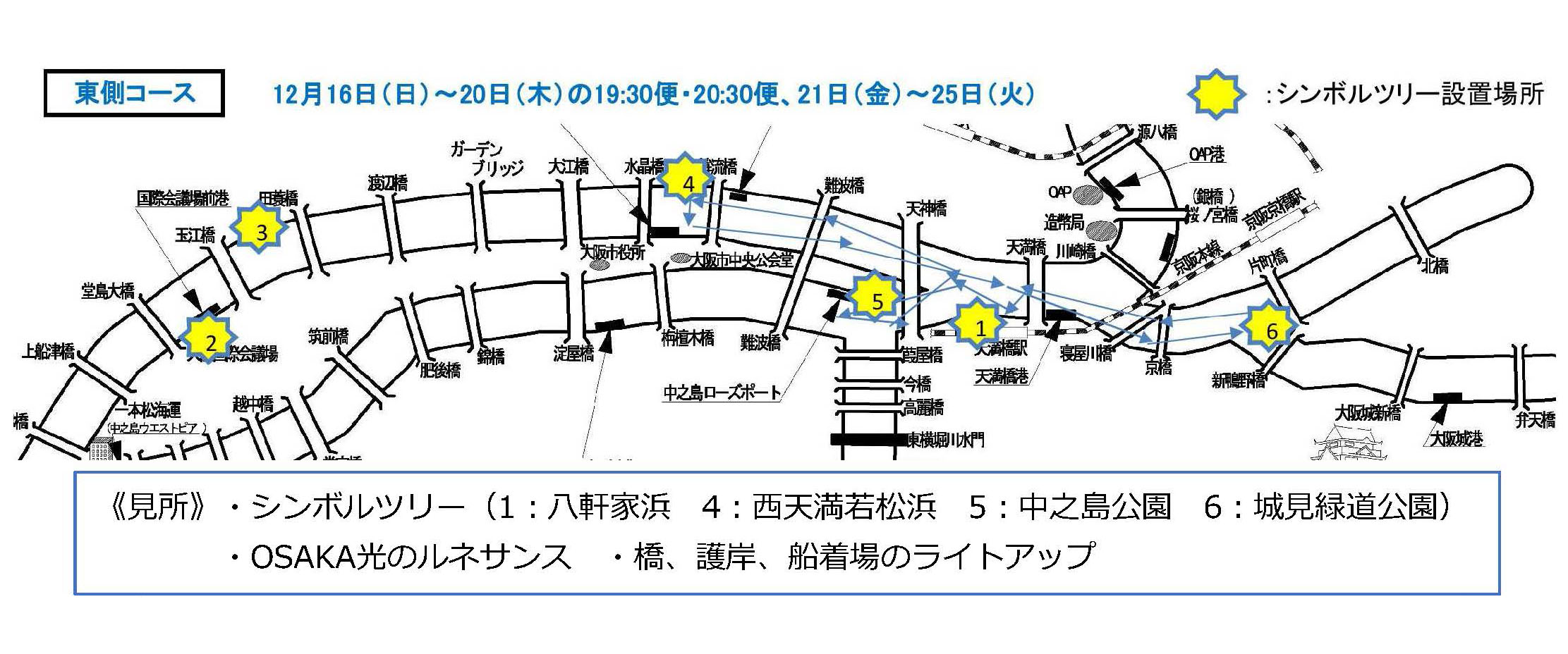 東側コース:八軒家浜船着場~土佐堀川(剣先南側で折返し)~堂島川(大阪市中央公会堂前