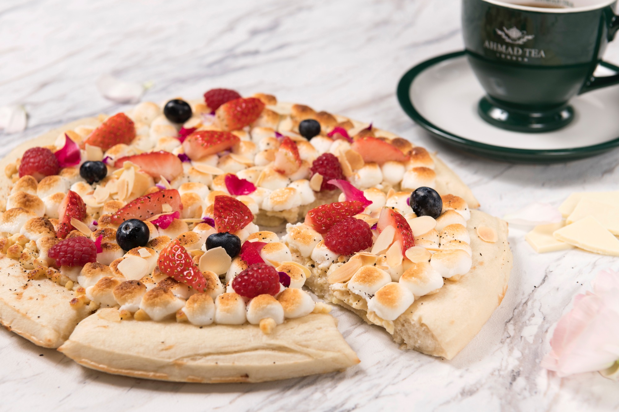 ピザ生地にホワイトチョコレートのチャンクとグレイトテイストアワードで1つ星を受賞した「AHMAD TEA」のアールグレイの茶葉、マシュマロをのせて焼き上げ、さらに仕上げに茶葉、ミックスベリー、エディブルフラワー、ローストアーモンドをトッピングしました。ホワイトチョコレートのほどよい甘さとアールグレイの上品で豊かな香りが口の中で広がります。