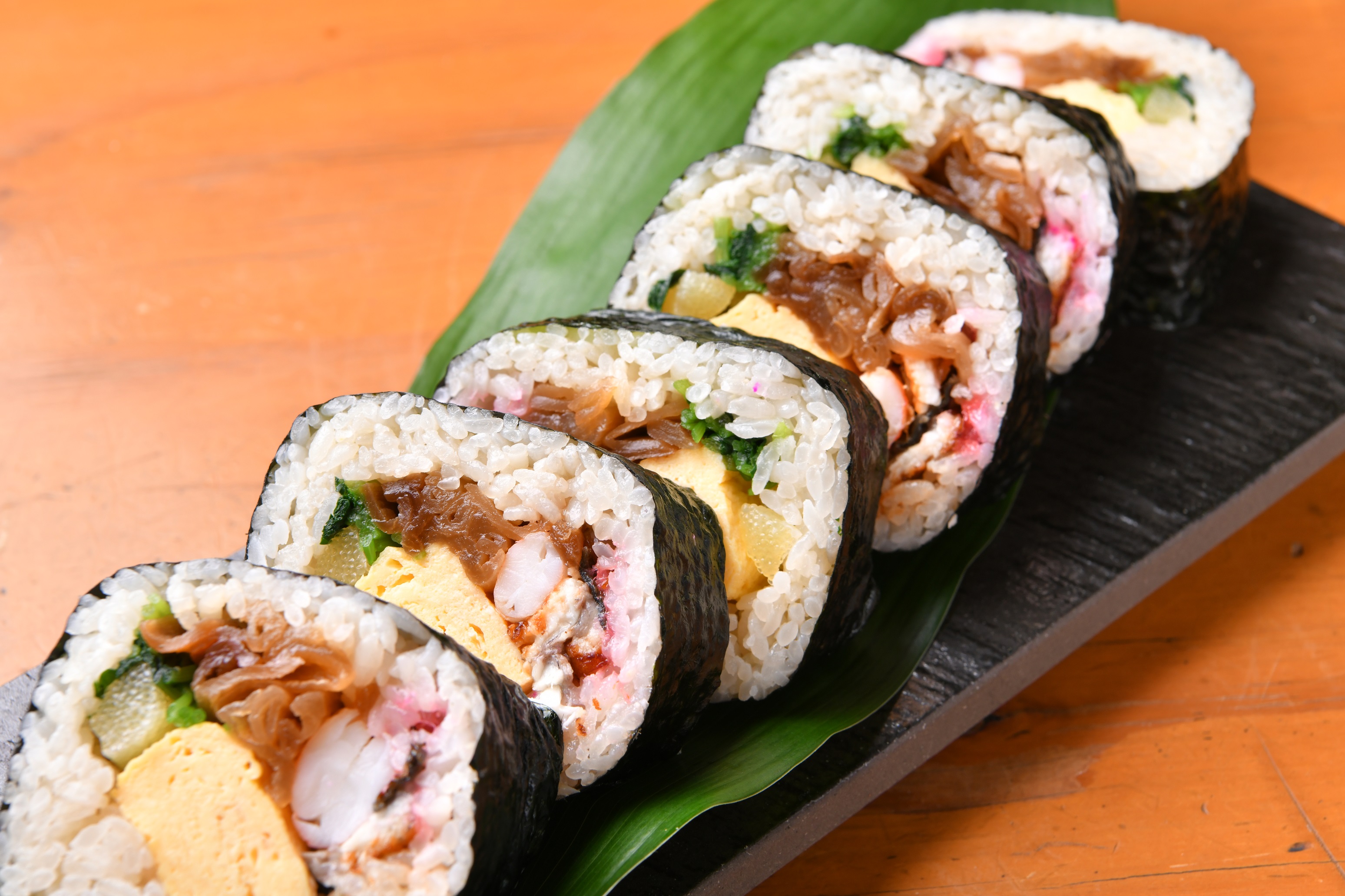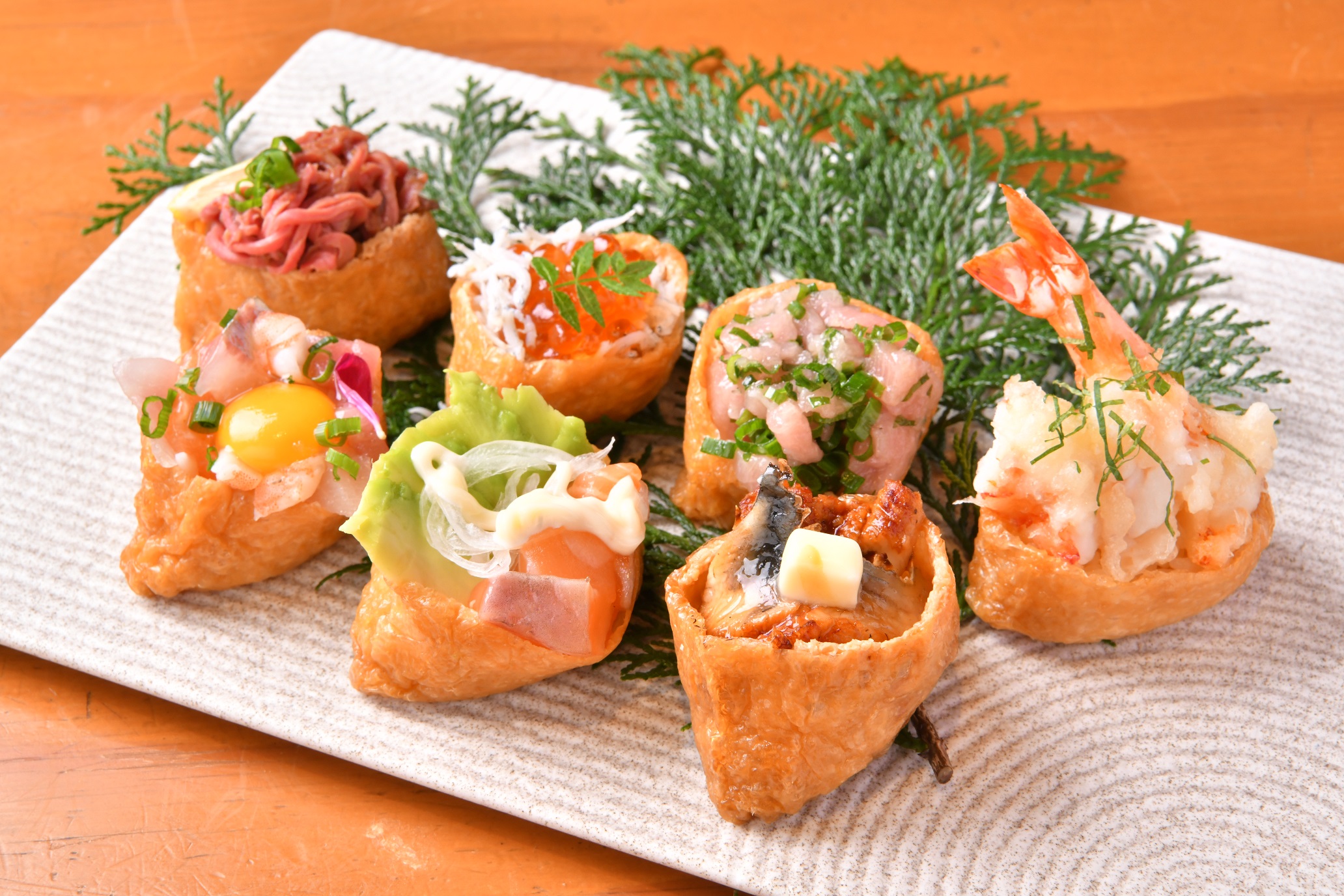 シャリは、ソフトな粘りが特徴の「ササニシキ米」を使用。さらに山吹の赤酢を使い、まろやかで上品な味わいに仕上げました。寿司は、1貫80円~のリーズナブルな価格で提供し、約50種類の豊富なネタを揃えます。「玉子」(80円)「えび」(200円)「大トロ」(300円)などの定番はもちろん、油揚げでシャリを包んで、洋風な具材をのせた創作揚げ巻きなどの一風変わったネタもご用意しております。