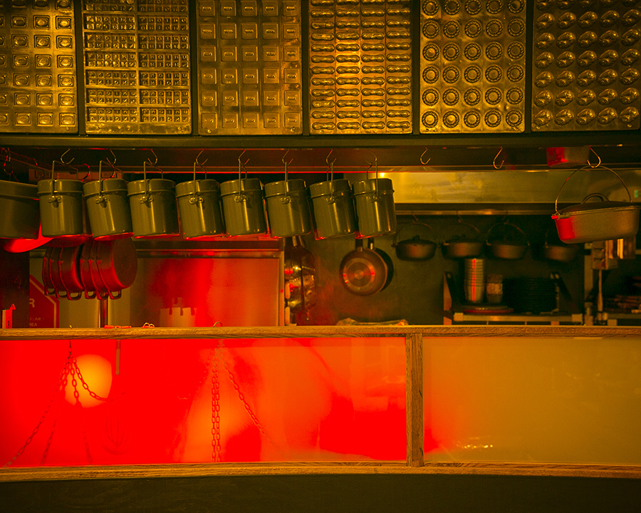 キッチン内に「片面焼きステーキ」だけをつくる区画があり、その部分はスモークガラスで隠しています。区画に入れるのは、社内でも代表を含め、たった 3人だけ。レシピ、下処理方法、火入れの仕方など、すべてが謎に包まれた看板メニューです。かぶりついたときに、レアと焼きの 2 つの食感を楽しめるお肉をどうやってつくっているのか、想像を膨らませながらお召し上がりいただけます。