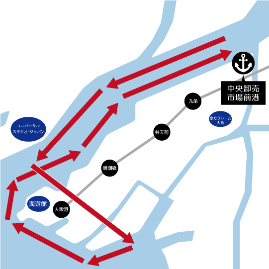 周遊時間は約2時間30分。中央卸売市場前港を発着地とし、海遊館の観覧車、みなと大橋、天保山大橋など、大阪ベイエリアの景色を一流鮨職人の鮨とともにお楽しみいただけます(稀に、天保山岸壁に停泊している旅客船や外国船を見ることもできます)。 ※潮位や天候により、やむを得ずルートを変更する場合があります