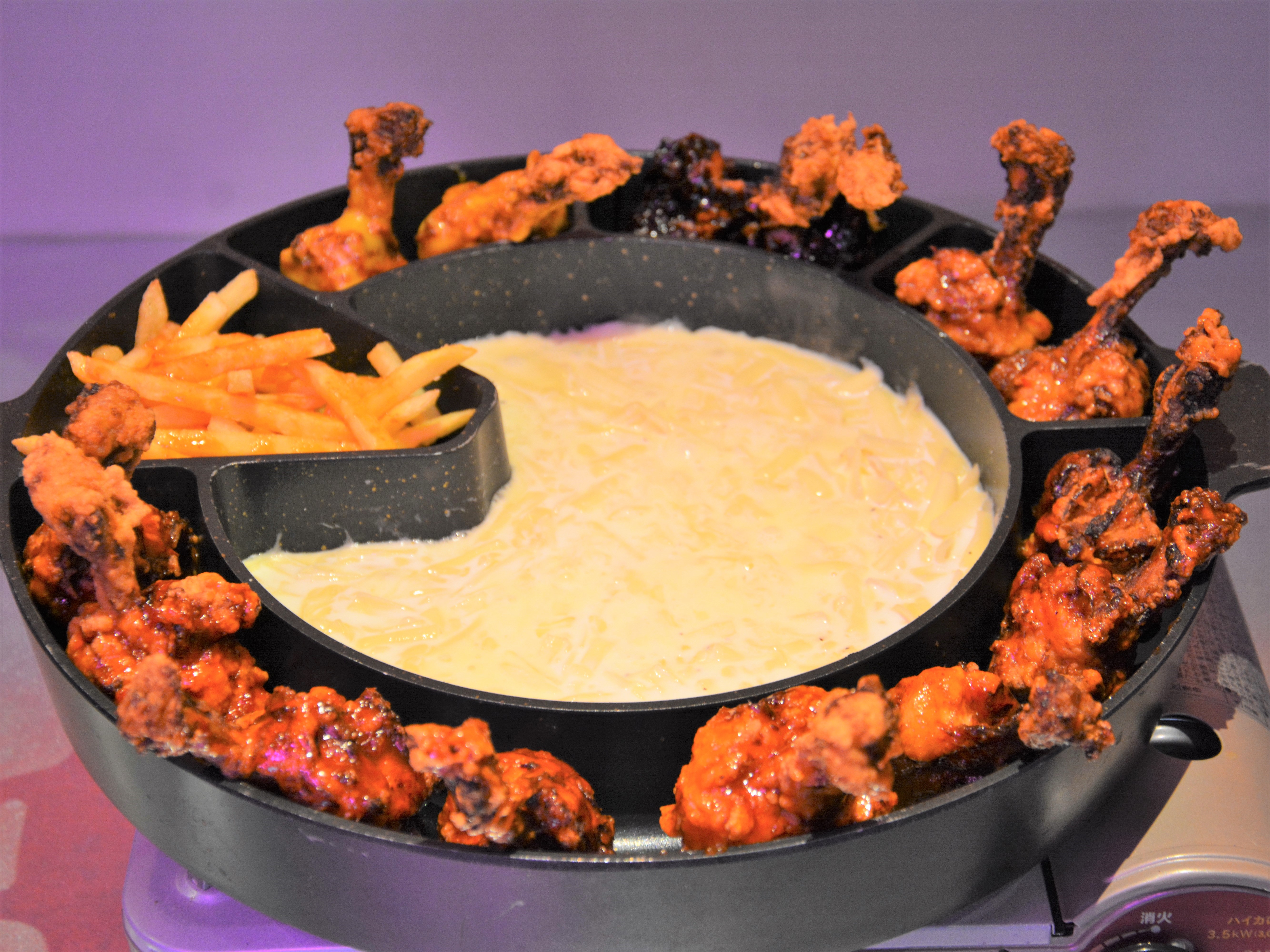 内 容 :4種(ヤンニョム・ハニーマスタード・甘味噌・チリマヨ)の味の骨付きチキン14本、大人気のヤミつきポテト、たっぷりチーズ
