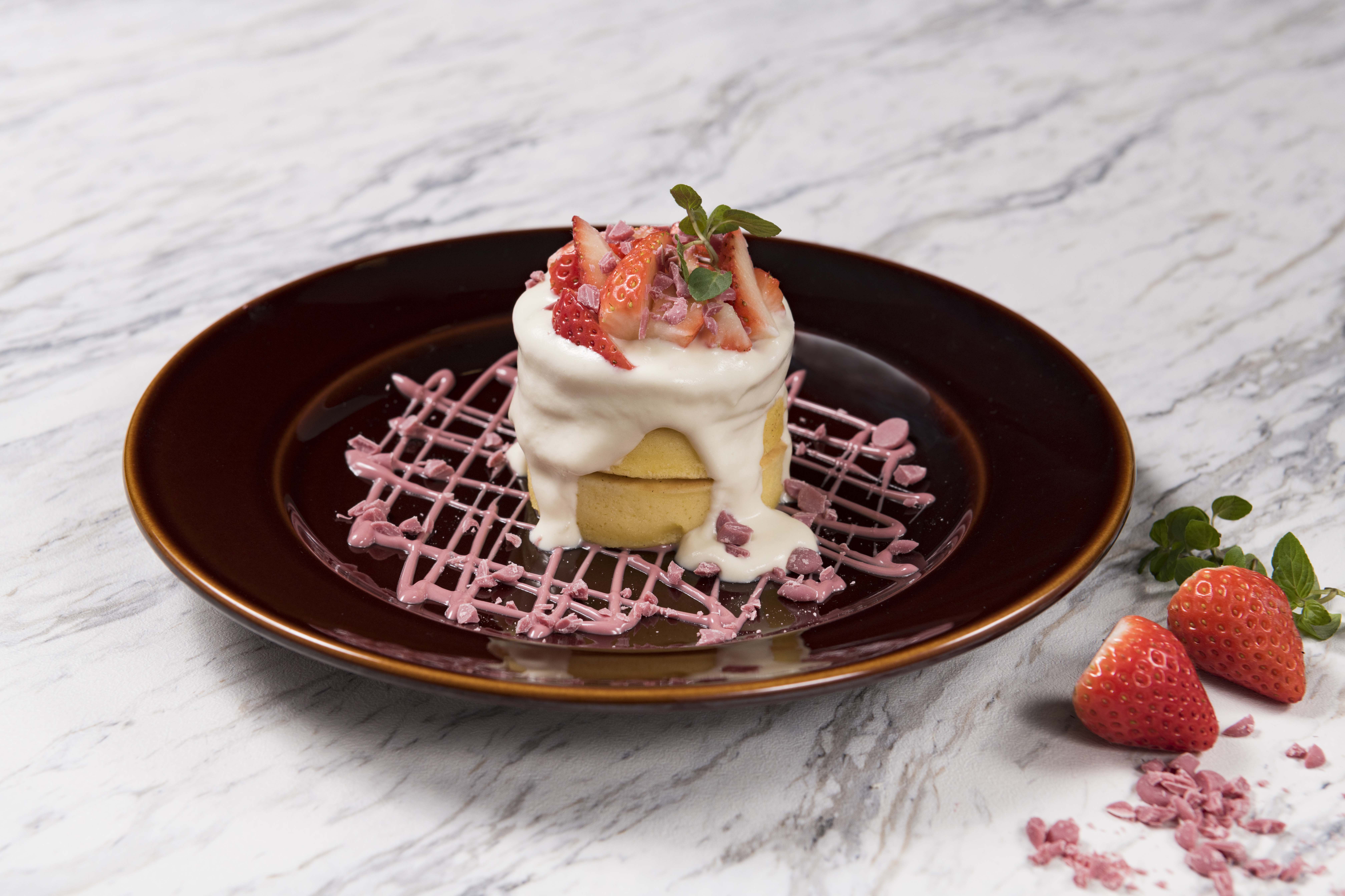 品の良い「甘み」とフルーティーな「酸味」がバランスよく味わえるスターイチゴ「きらぴ香」と、ベリーのようなフルーティーな酸味の「ルビーチョコレート」、「ホワイトチョコレート」のマリアージュをパンケーキとともにお楽しみください。