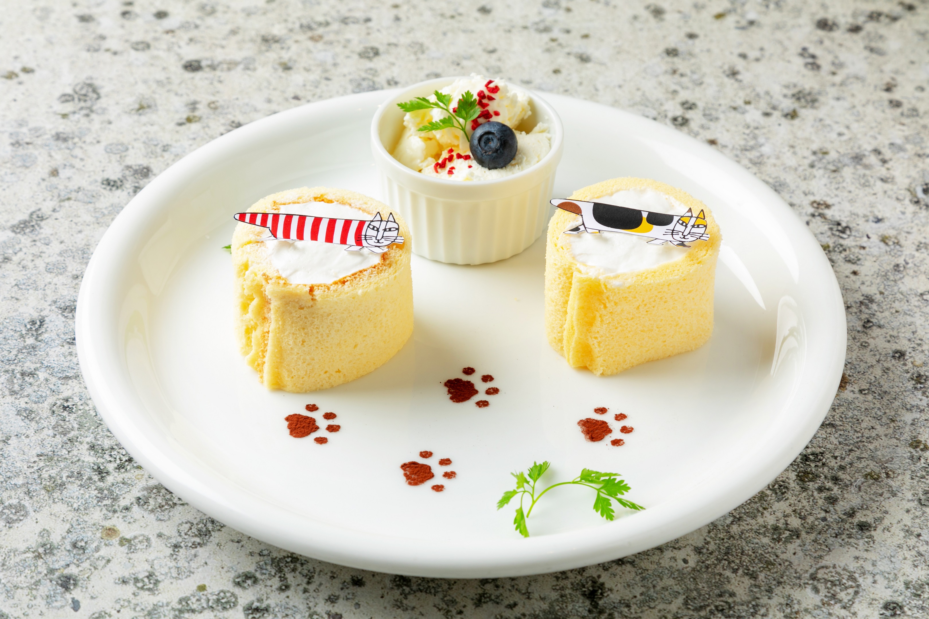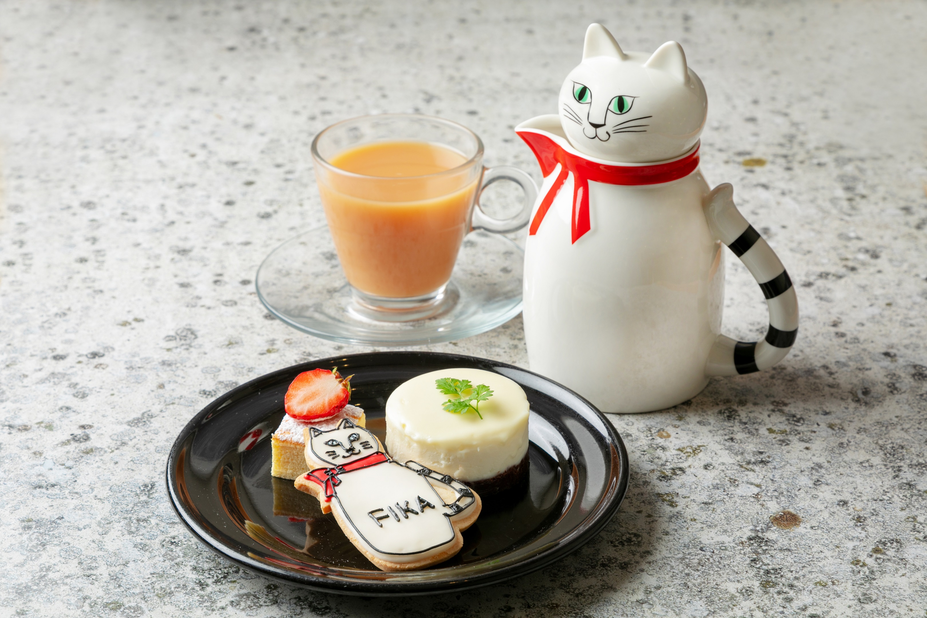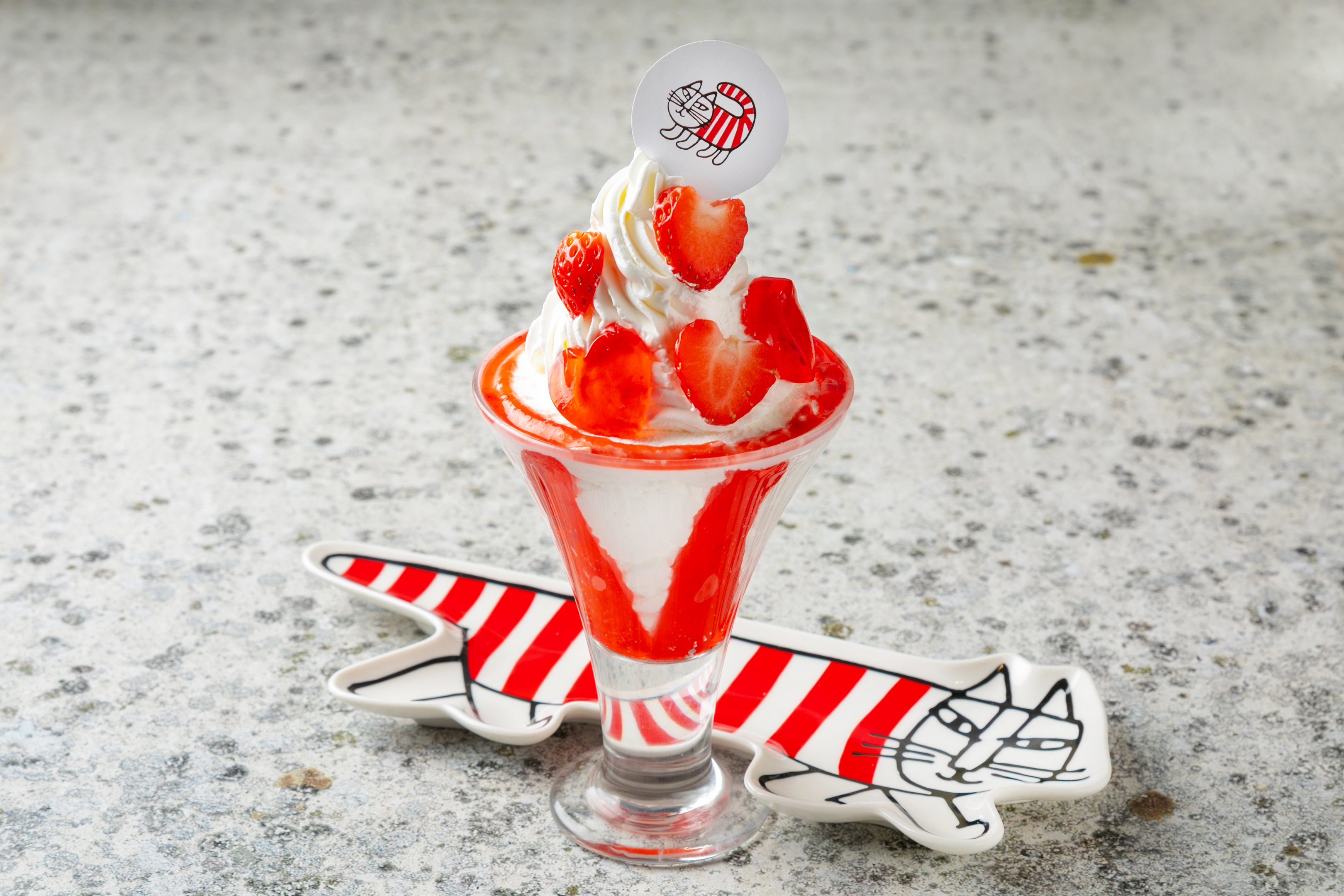 コラボの猫メニューは、全10種類。赤と白のマイキーカラーをイメージした「ベイビーマイキーのいちごパフェ 」や「マイキーのしましまストロベリーラテ」の他、第1弾の「リサ・ラーソンコラボカフェ」で提供した復刻版グッズの猫の形のティーポットで楽しむ人気メニューもバージョンアップし再登場。デンマーク発祥のオープンサンド「スモーブロー」をミンミのプレートで提供する「北欧のよくばりスモーブロープレートセット」などフードメニューもご用意します。