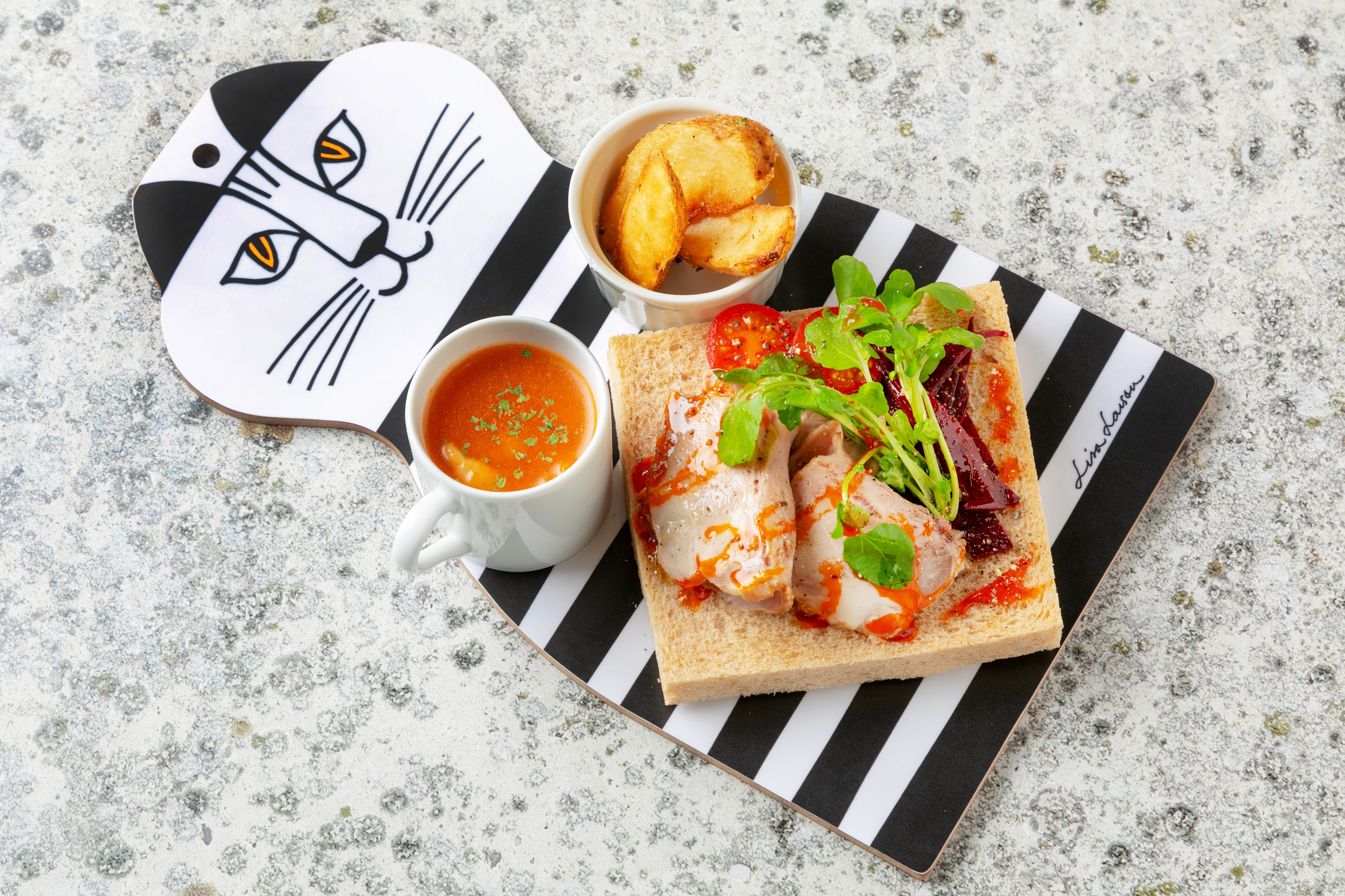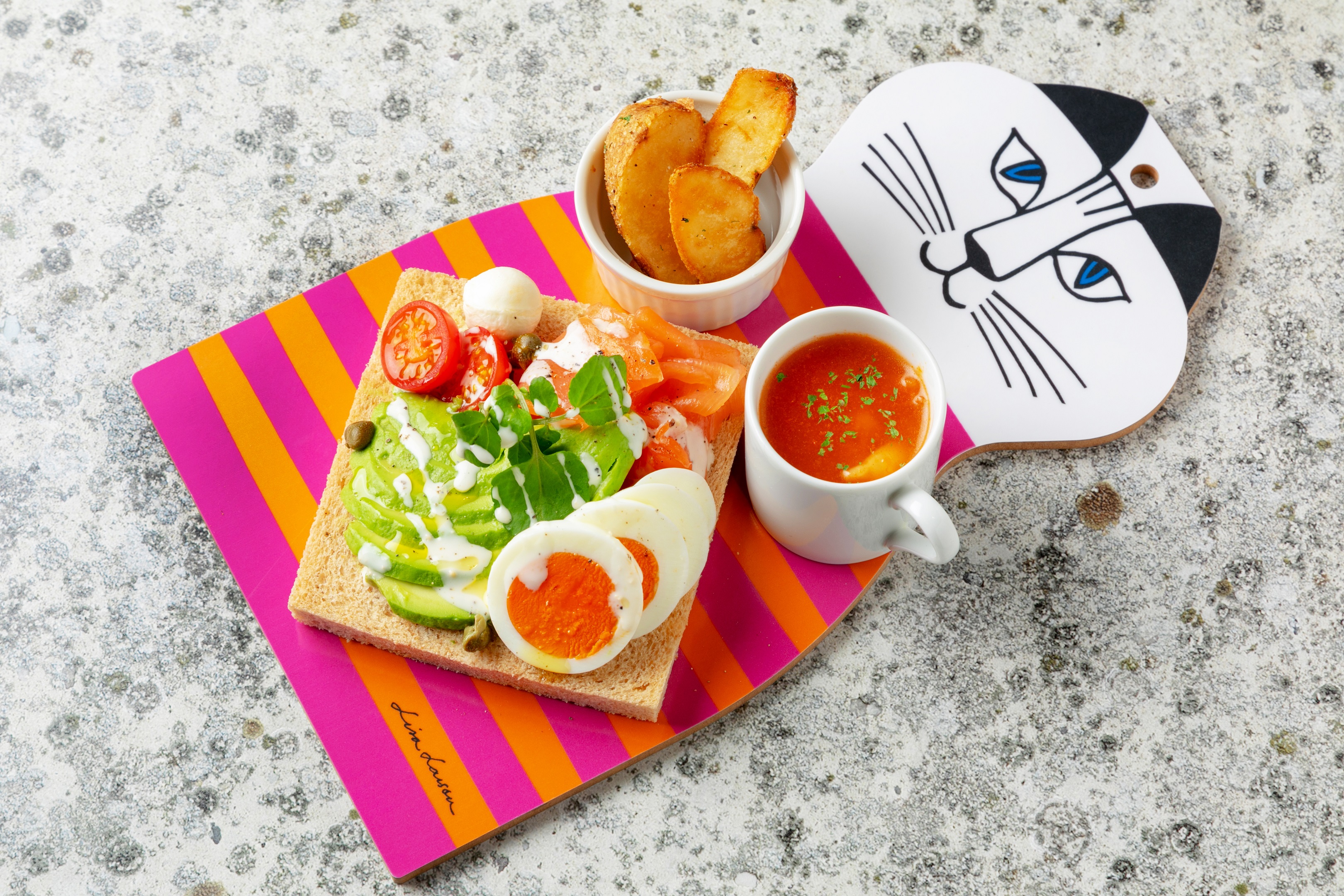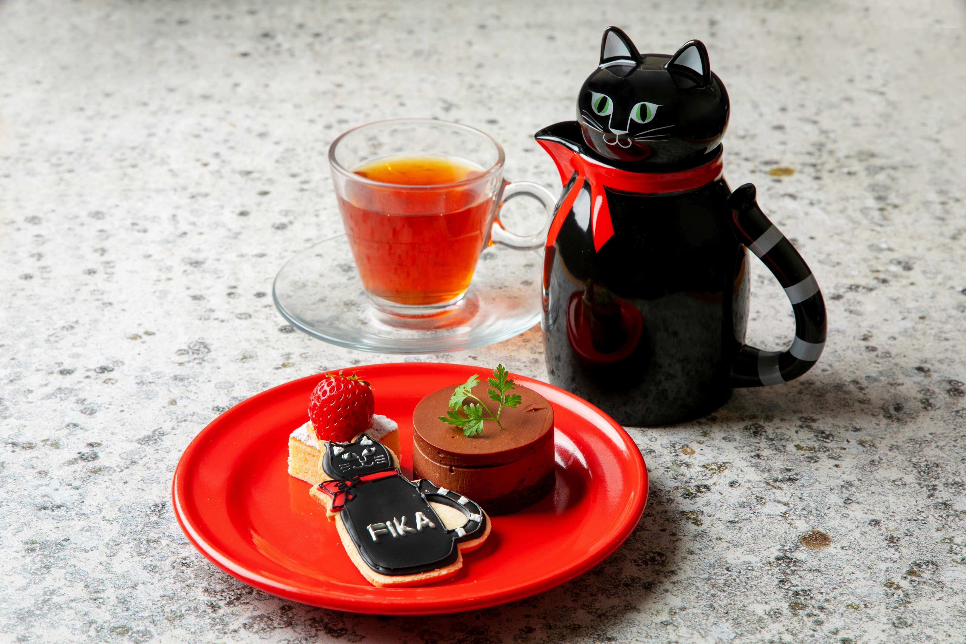 コラボの猫メニューは、全10種類。赤と白のマイキーカラーをイメージした「ベイビーマイキーのいちごパフェ 」や「マイキーのしましまストロベリーラテ」の他、第1弾の「リサ・ラーソンコラボカフェ」で提供した復刻版グッズの猫の形のティーポットで楽しむ人気メニューもバージョンアップし再登場。デンマーク発祥のオープンサンド「スモーブロー」をミンミのプレートで提供する「北欧のよくばりスモーブロープレートセット」などフードメニューもご用意します。