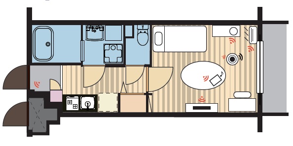 スマートロック機能は室内だけでなく、エントランスや勝手口等の共用部にも設置しており、スマートフォンを使って開閉が可能です。全てのIT機器は大崎電気工業株式会社の製品を使用していますが、全て同社の設備で動かせる学生向けマンションは全国初です。今後、当社提供の入居者サポートアプリとの連携も予定しています。