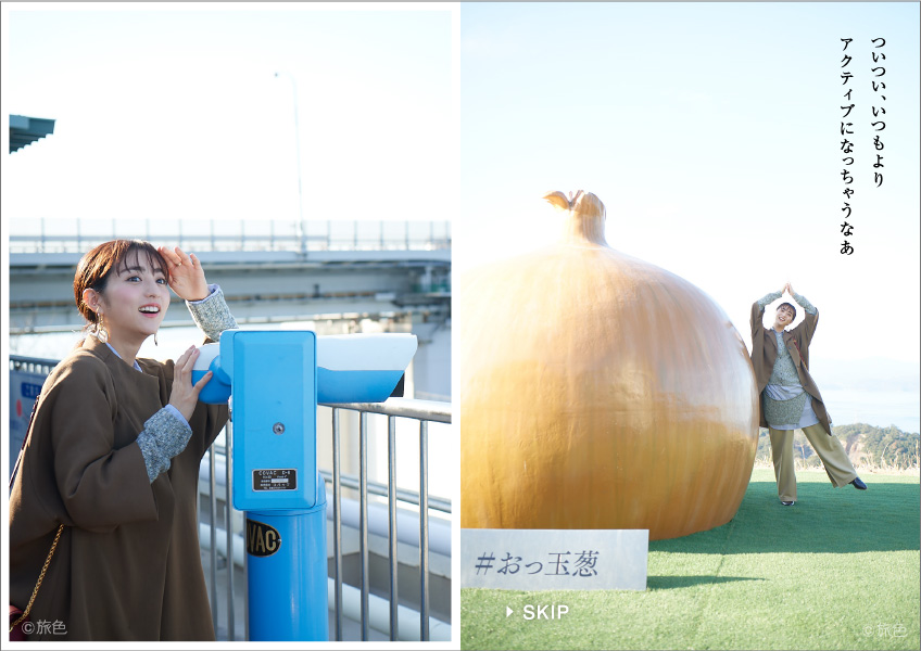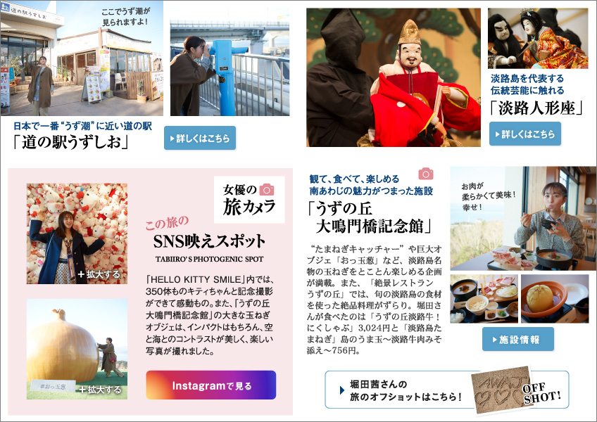 国生み神話の島としても知られる自然豊かな淡路島。海や山の景色を楽しみながら美味しいものを食べ、話題のスポットで遊び、温泉でのんびりすれば、癒されること間違いなし。松阪牛・近江牛・神戸牛といった世界的にも有名なブランド牛肉のルーツとしても知られる淡路和牛や名産のタコなど、食の宝庫・淡路島には美味しいものが盛りだくさん。また、カラフルなのにどこかレトロなイラストが描かれた壁のある海岸や、本物の玉ねぎを掴むクレーンゲーム「たまねぎキャッチャー」、人間の身長より大きな高さ2.8mの巨大玉ねぎのオブジェなど、ユニークでフォトジェニックなアートスポットもたくさん。「ここはどこ?って言いたくなるような画が撮れておもしろいです。」と、普段写真をあまり撮らないという堀田さんも、旅の途中、夢中でカメラを向けた場所にも注目です。