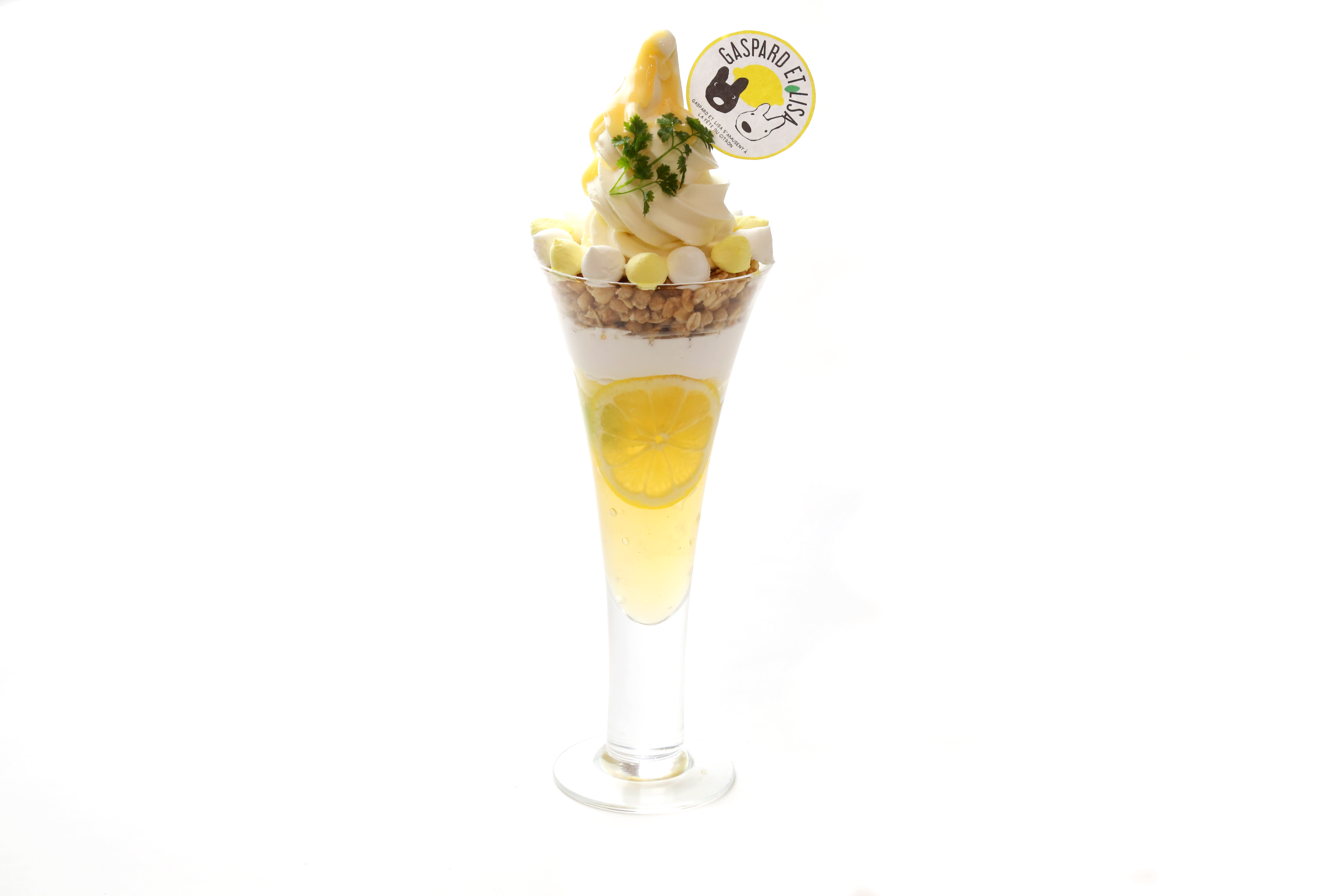 シャンパンゼリーやキウイ、グレープフルーツ、レモン、グラノーラ、ソフトクリームが入ったレモン風味のパフェ。