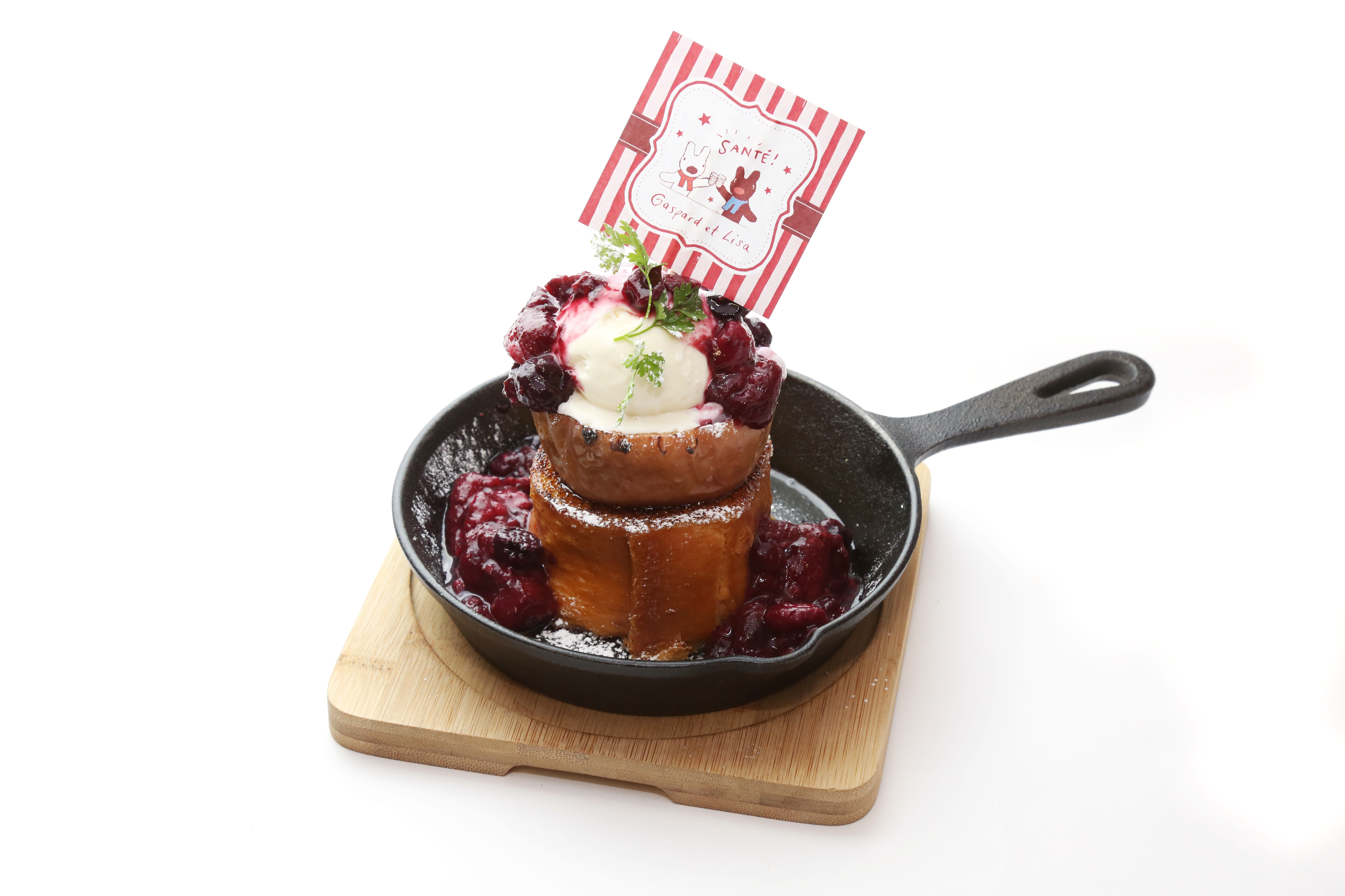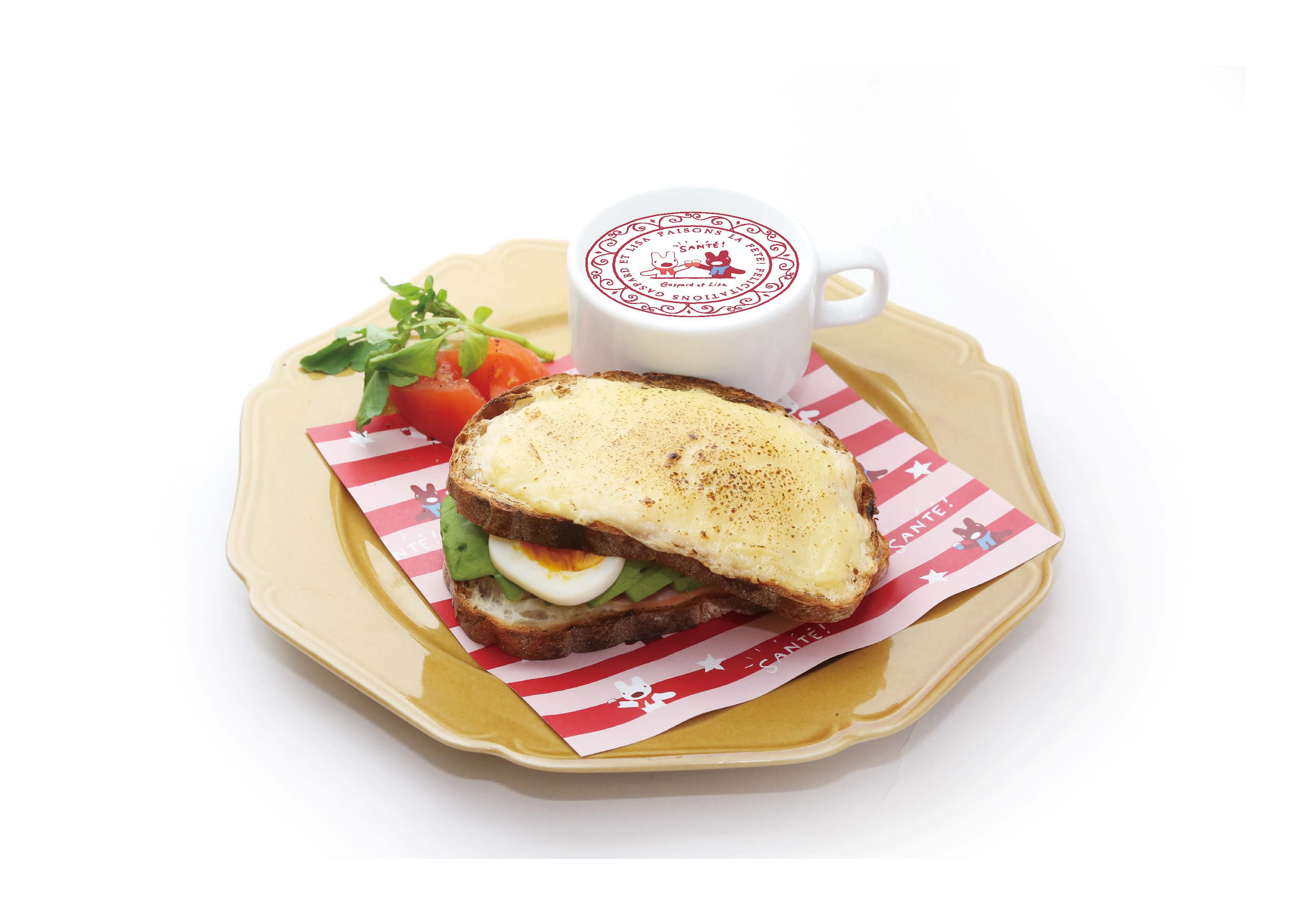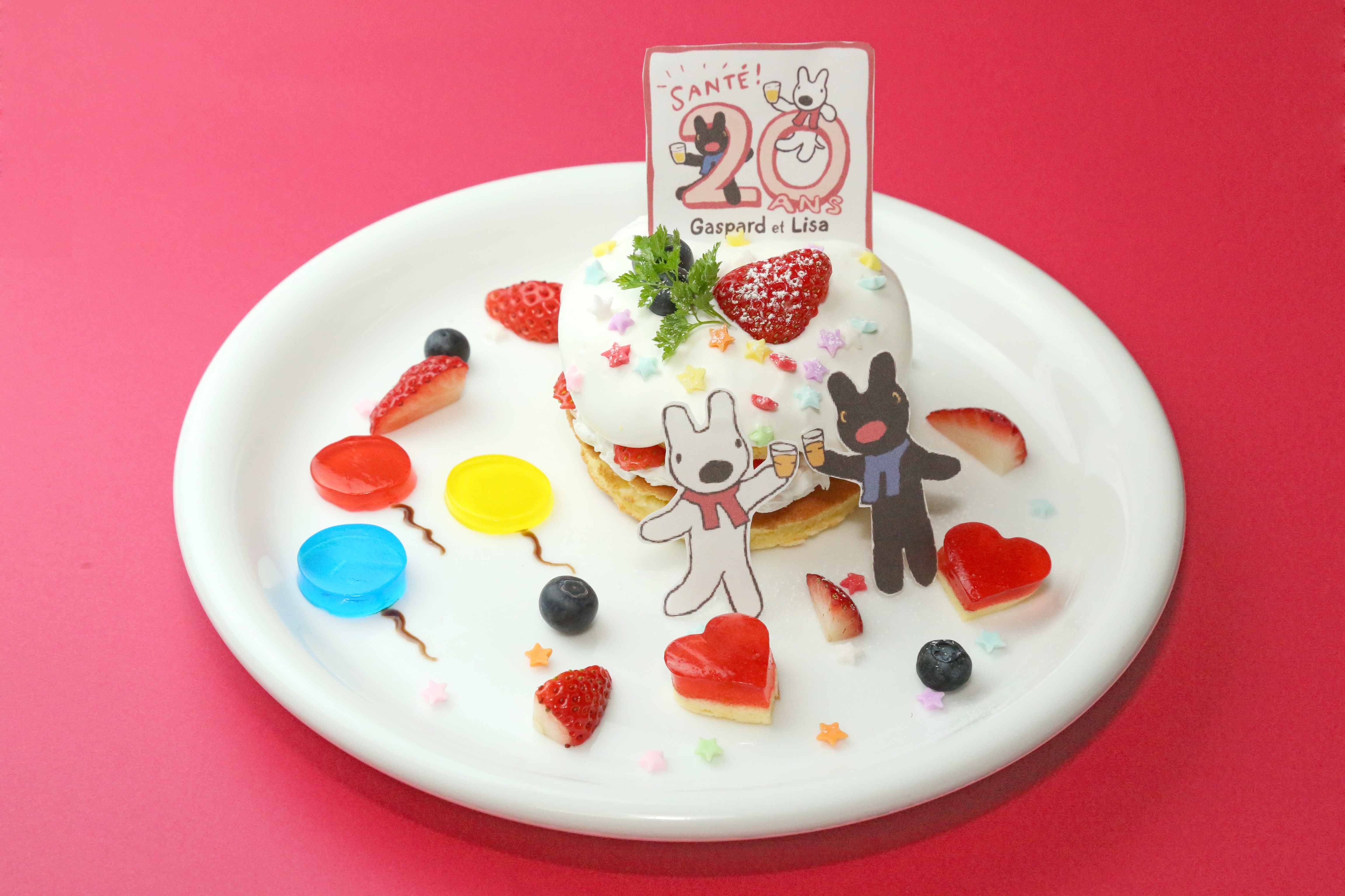 今回20周年を記念し、コラボカフェを開催します。テーマは、フランス語で「乾杯」を意味する言葉「SANTÉ!」。20周年限定イラストを使用したメニューなど全8品揃います。グラスを持ったリサとガスパールが、バルーンやハートとカラフルな星を散りばめたイチゴの小さなホールケーキでお祝いする「リサとガスパール 20th Happy anniversary plate」の他、パリジェンヌ・パリジャン気分を味わえるフランスをイメージしたクロックムッシュサンドやニース風クレープサラダなどのお食事メニューも揃います。