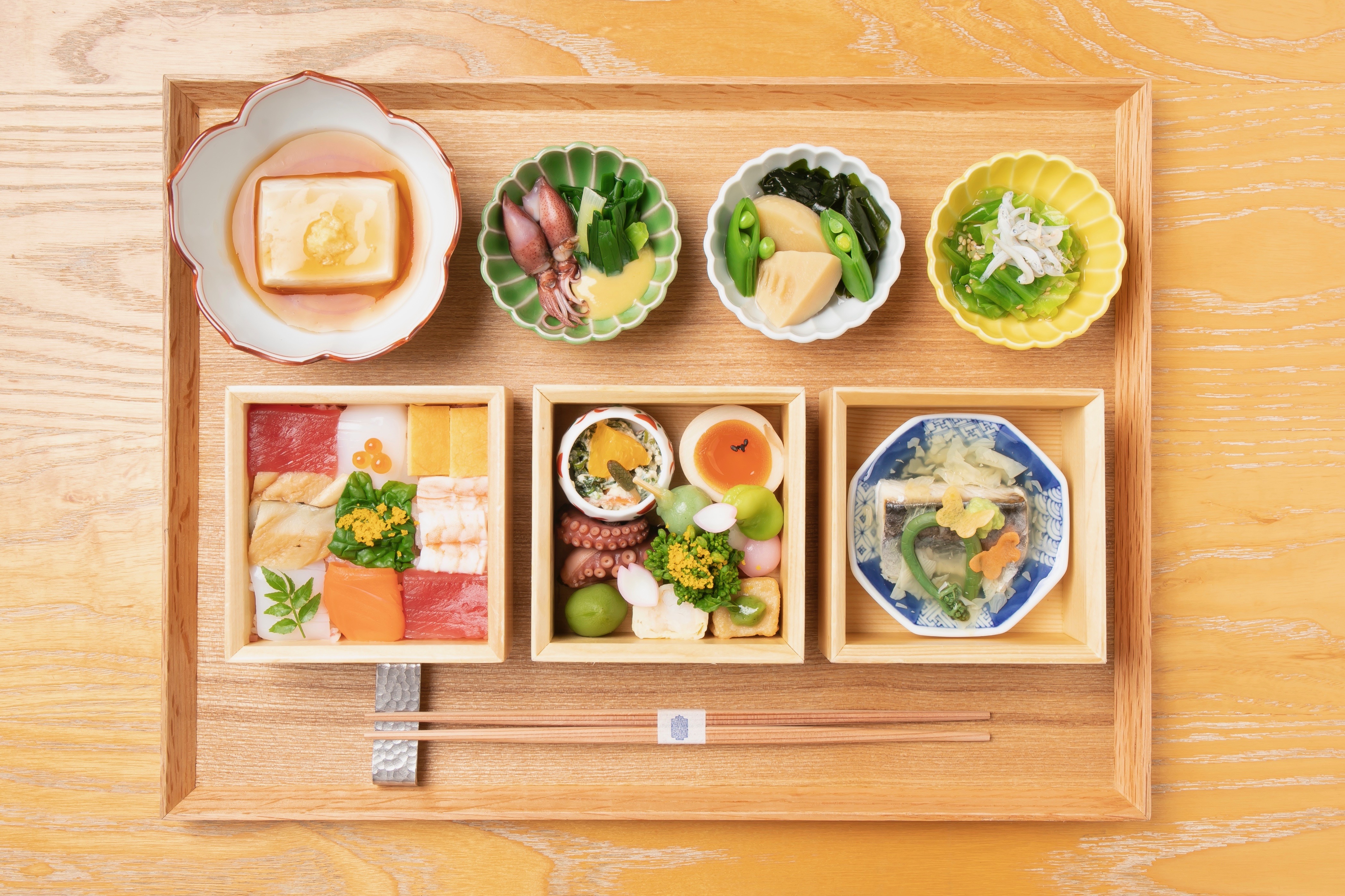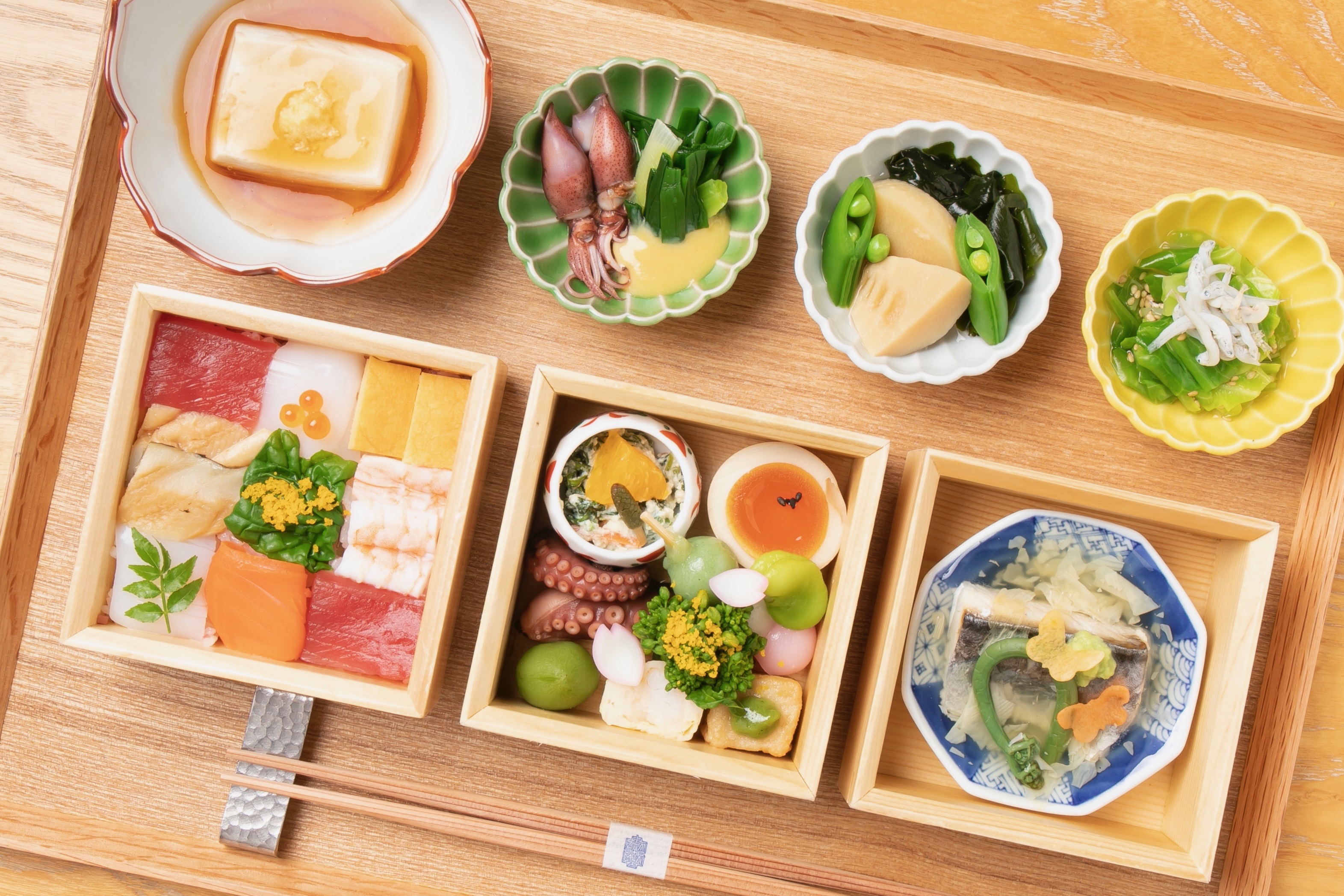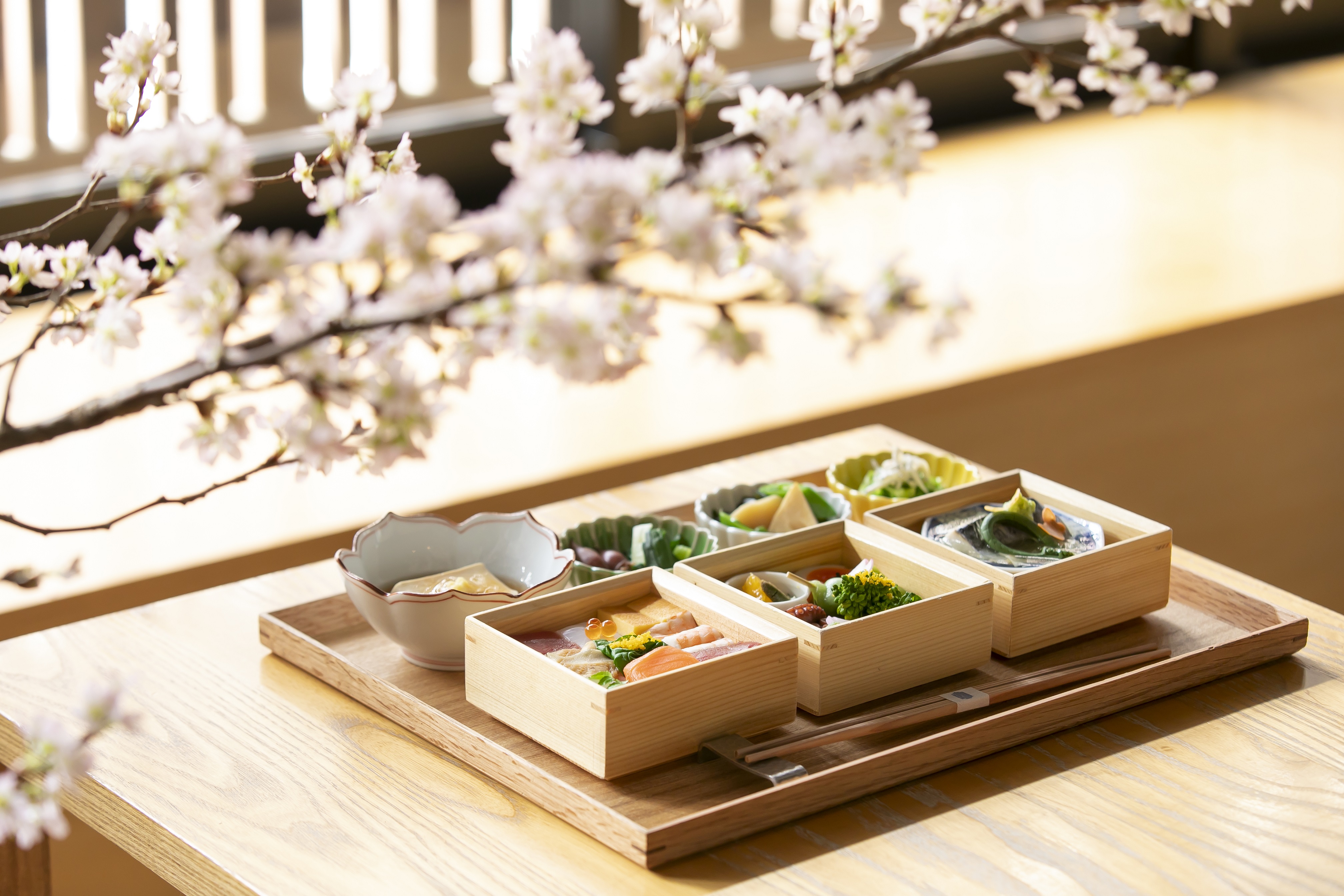 季節毎に旬の食材を取り入れたおばんざいをお楽しみ頂くIZAMAの看板昼食メニューを、京都の観光シーズンである桜の時期に合わせた特別仕様でご用意します。「春の行楽弁当」をテーマに、小さな三段のお重に春のおばんざいをぎゅっと詰めました。具材を小市松模様に並べた「桜のちらし寿司」をはじめ、2匹の蝶が舞う「鰆の酒蒸し 湯葉餡掛け」、季節を感じる八寸などをご用意します。