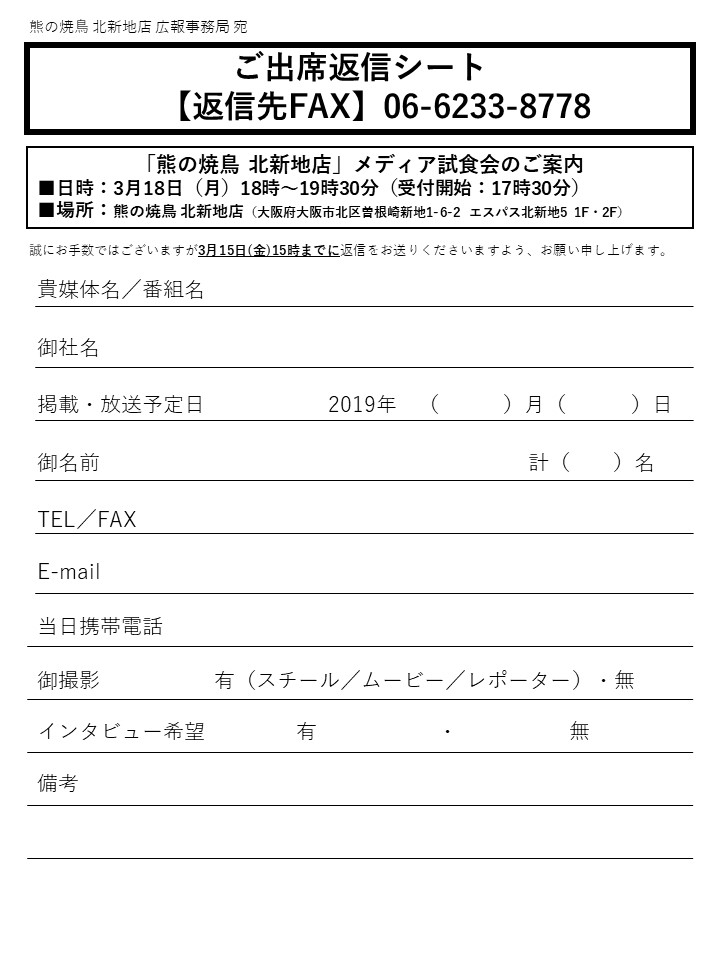 ■「熊の焼鳥 北新地店」メディア試食会のお知らせ
