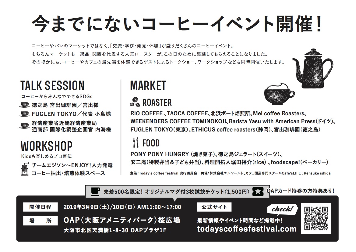 株式会社フードデザインラボ運営のカフェ開業専門スクール「Cafe’s LIFE」は、今回のイベントをTODAY'S COFFEE FESTIVAL実行委員会と共に2019年3月9日(土)、3月10日(日)、大阪OAP(アメニティーパーク)桜広場にて開催します。