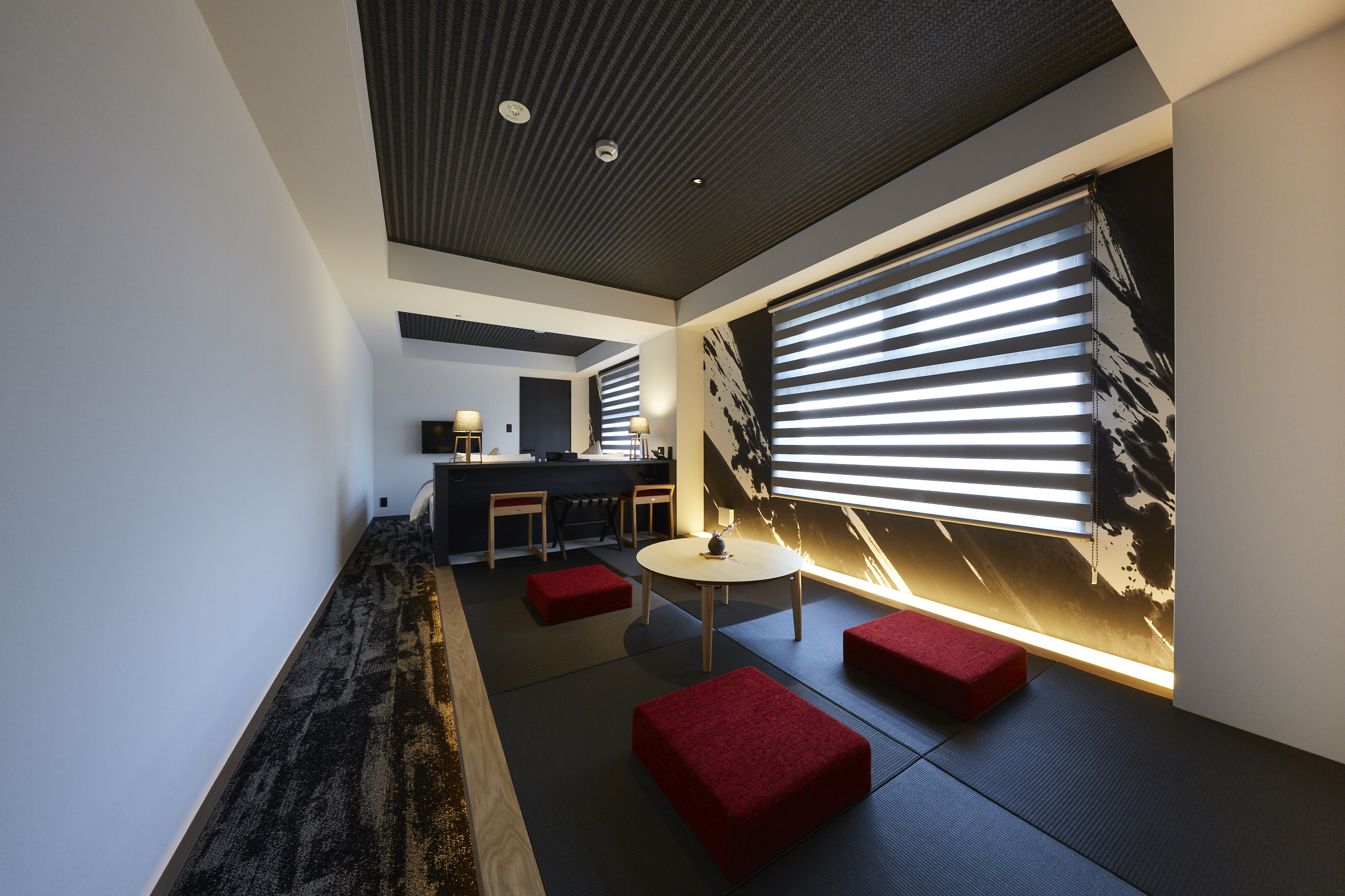 51棟目となる当ホテルのコンセプトは、「COOL JAPAN×WABI-SABI」。これまでの温かみのある和モダンテイストを一新し、「黒」と「白」で統一しました。客室の壁面には、ダイナミックな墨アートを施す(内8室)など日本の「かっこいい」要素を取り入れております。また、京の伝統工芸品やアート作品を設置することで、モノクロの中に”彩り“も加えた空間に仕上げました。京の下町にある中で建物自体は主張せず、ゲストはもちろん、ホテル内に配置された家具や芸術作品などを引き立たせる光と影のような空間を表現します。リラックスできる空間で日本を感じ、和の心に触れていただけたらと考えております。