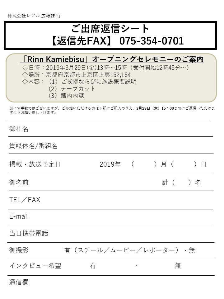 京都市内で宿泊施設50棟を運営している株式会社レアル(本社:京都市下京区、代表取締役:児玉舟)は2019年4月1日(月)、51棟目となるホテルタイプの宿泊施設「Rinn Kamiebisu」(京都府京都市上京区上夷町152,154)を京都駅付近にオープンいたします。オープンに先駆け、3月29日(金)にオープニングセレモニーを開催いたします。