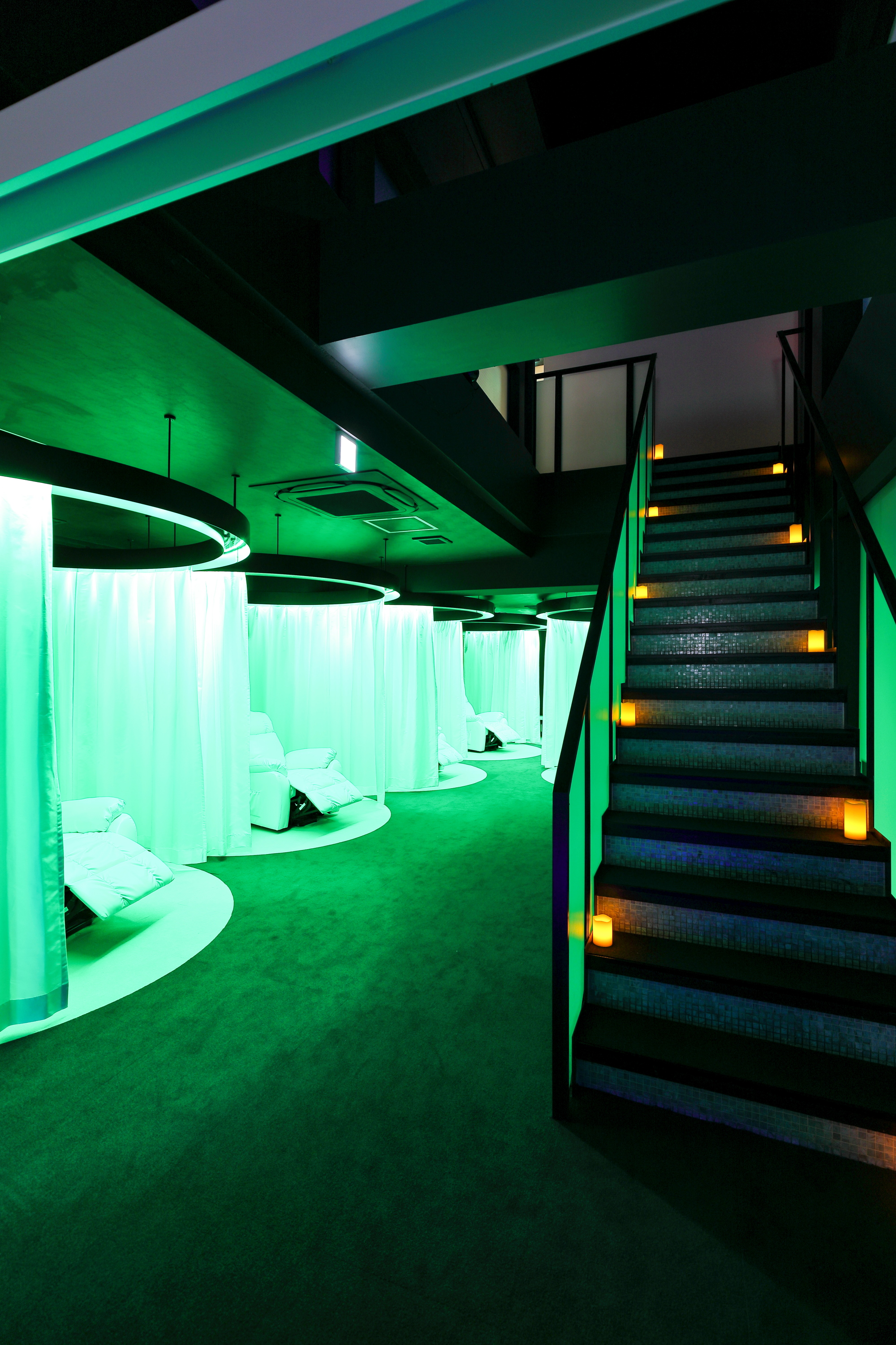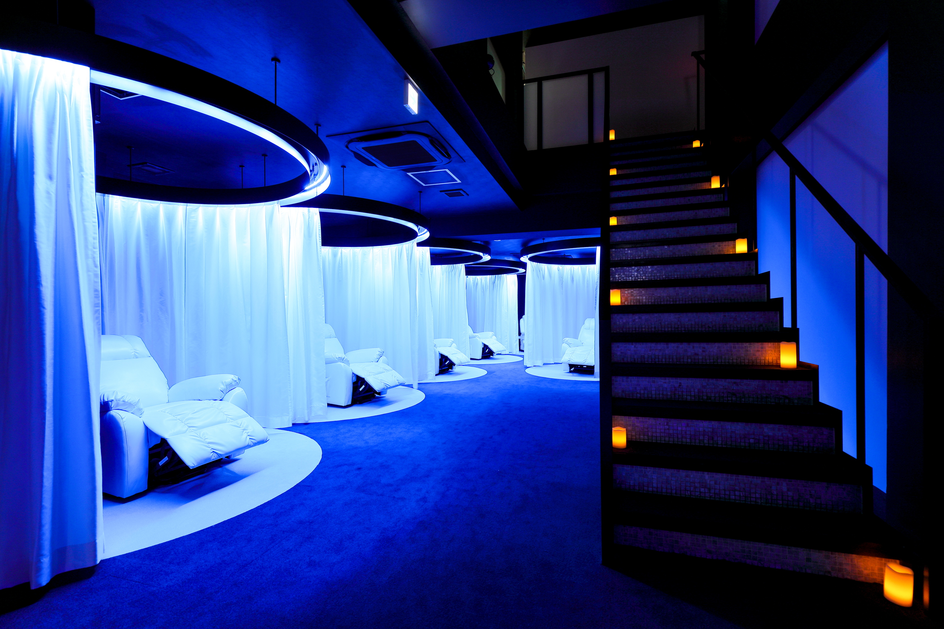 店内は、お客様によりリラックスしていただけるようにと、「宇宙」をイメージした落ち着いた空間に仕上げており、曜日ごとに異なるBGMや照明を施すのも特長のひとつです。心斎橋店は2フロア構成で、3階が女性専用フロア(6席)、4階が男性専用フロア(4席)の全10席を設けております。深夜24時まで営業いたしますので、仕事終わりの方などにもゆっくりとお寛ぎいただけます。