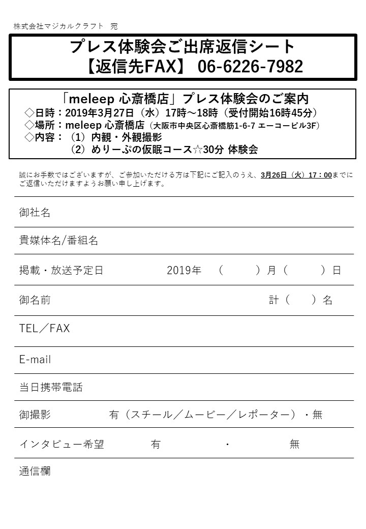 株式会社マジカルクラフト(本社:大阪市中央区、代表取締役:在間哲生)は2019年3月28日(木)、ドライヘッドスパ専門店「meleep(メリープ)心斎橋店」(大阪市中央区心斎橋筋1-6-7 エーコービル3F)を心斎橋筋商店街内にオープンいたします。