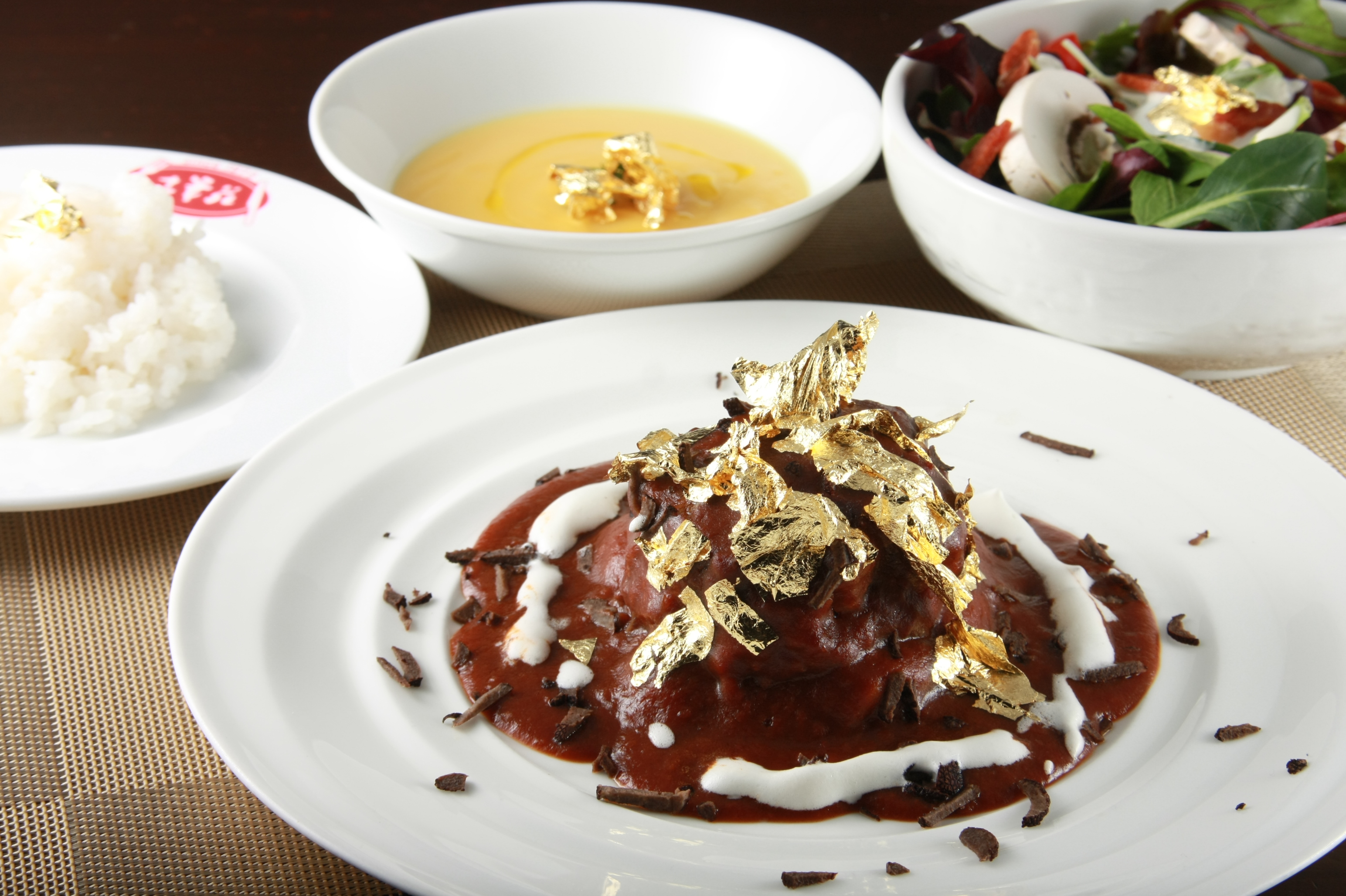 未来の社長へ金色づくしの豪快な一品。「鳴門『金』時さつまいものスープ」「『金』華ハムのシーザーサラダ」「『金』箔ハンバーグ」。ライスにも金箔!