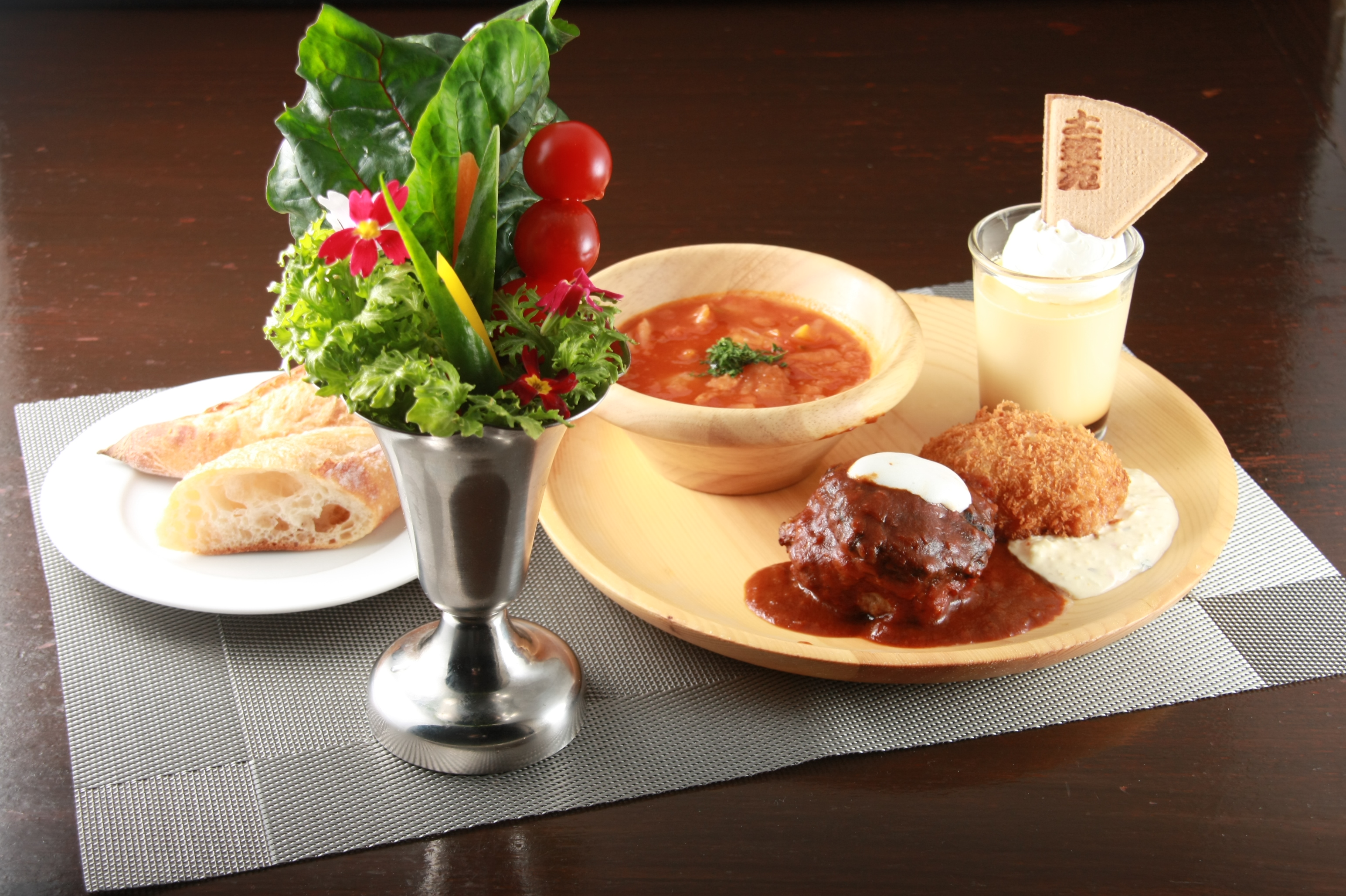 可憐な銀色ランチョンマットに「ミニデミグラスハンバーグ」「プリプリ海老カツ」「土筆苑プリン」、花束風の「スティックサラダパフェ」が華やかさを添えます。