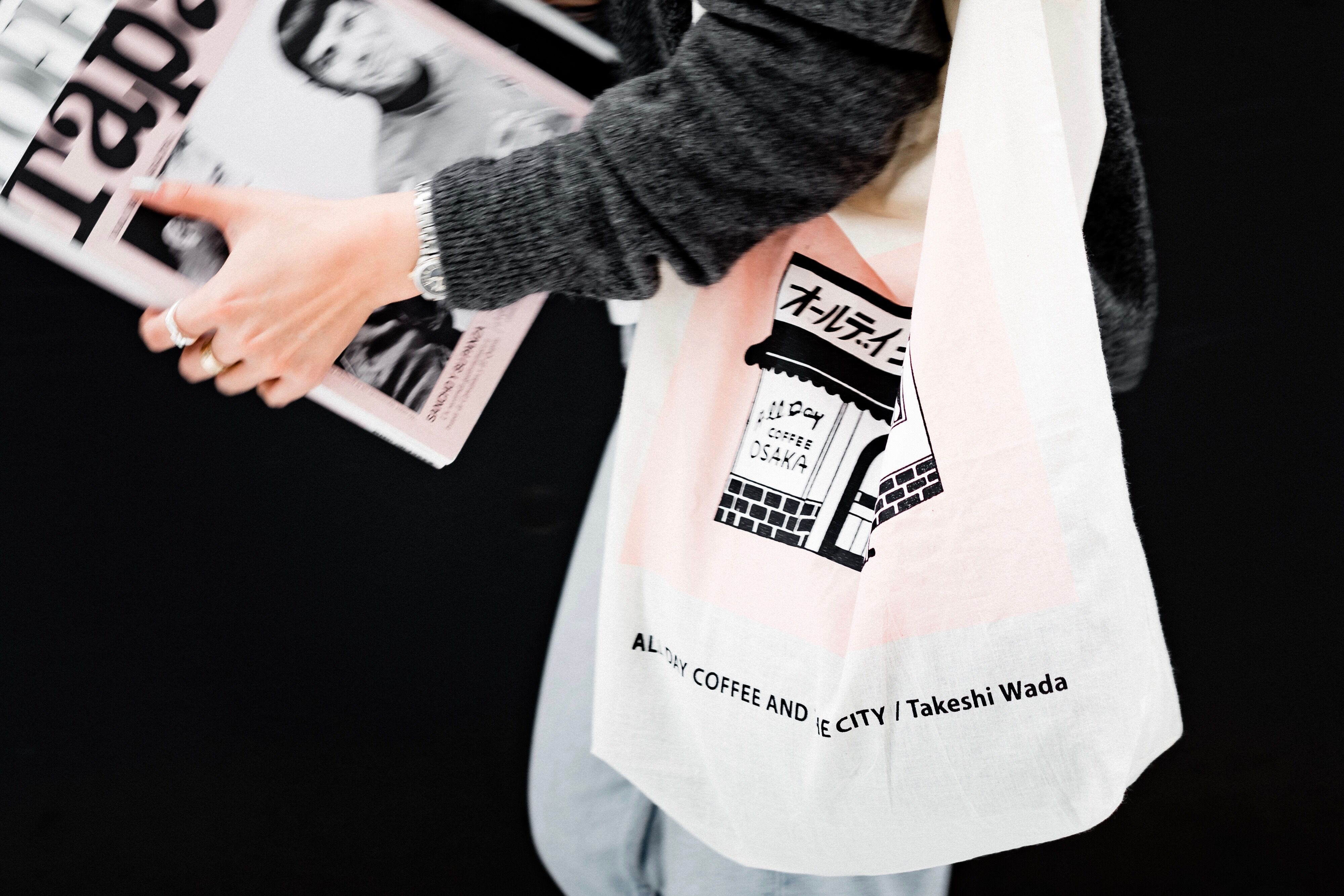 グランフロント大阪に店を構えるコーヒースタンド「ALL DAY COFFEE (オールデイコーヒー)」では、 2019年3月29日(金)から「ALL DAY COFFEE × TAKESHI WADA」によるコラボトートバックを限定発売致します。ブラックやカーキを基調としたロゴグッズを展開してきた従来のALL DAY COFFEEとは異なる、手描きでポップなカラーを取り入れた「大阪みやげ」にもなるトートバッグです。