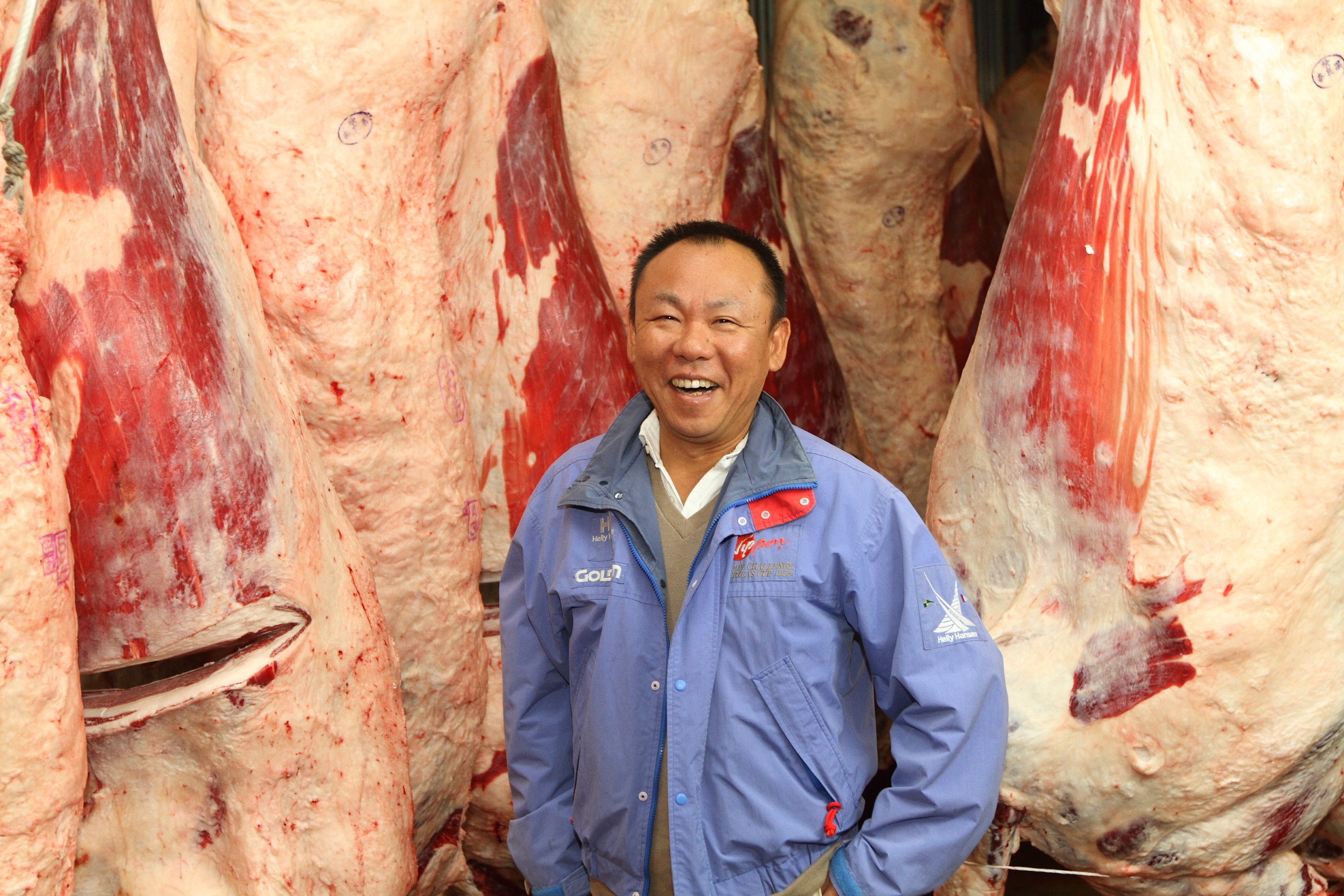 「やきにく萬野本店」に併設する精肉工場では、天井から高さ約2メートルの枝肉を吊るします。常時2頭分・左半頭・右半頭で全8本の枝肉を精肉工場で見学することができ、削ぎたて・捌きたての肉を焼肉店で扱うため、いつでも新鮮な肉をお客様に楽しんでいただけます。