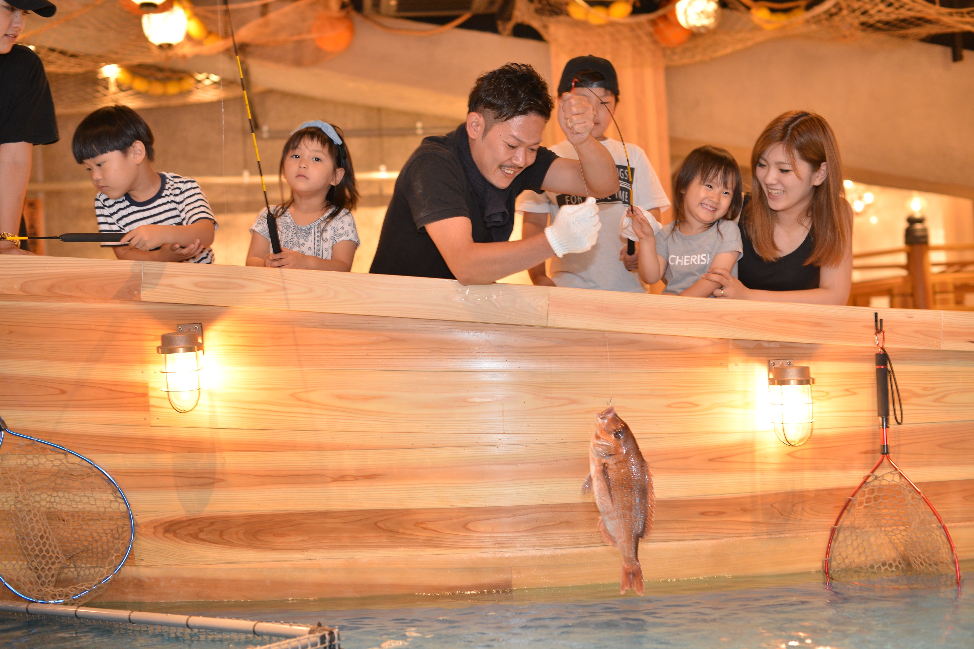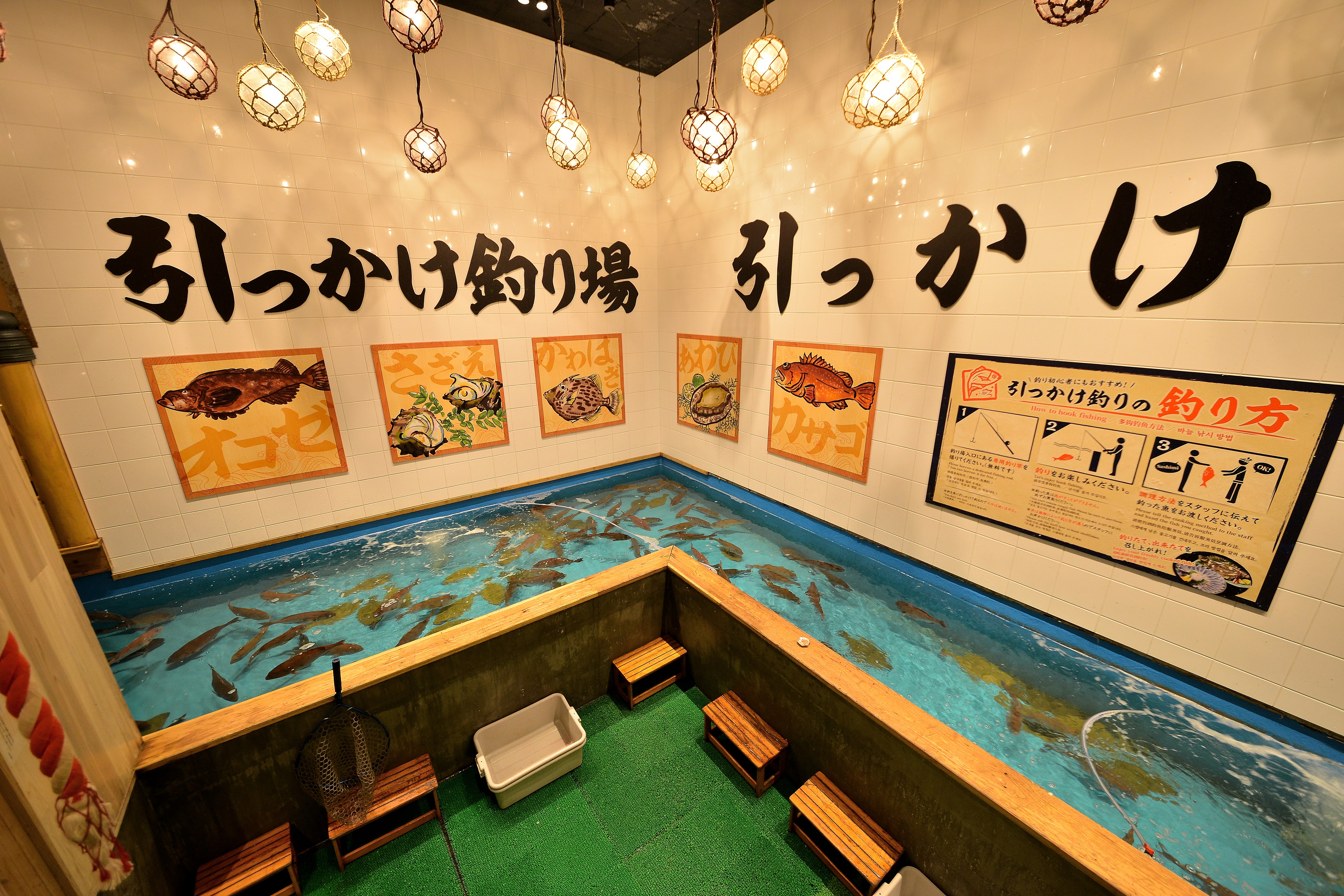 2号店は地下1階・1階の2階建て、広さ約600平方メートルで運営します。1階に長さ15メートルの漁船を1隻配置。地下1階には小さなお子様でも簡単に釣りを楽しめる「引っかけ釣り場」を設けております。釣った魚は1号店同様、自己責任です。自分が仕掛けた罠にまんまとハマった魚をお好みの調理法から選んでお楽しみいただけます。また、2号店は、新たにフグと淡水魚が仲間入りします。フグを釣って、その場で調理して楽しむことが出来る釣船居酒屋は関西初です。そのほか、鯛や平目などの定番の魚から、ニシキエビや月光貝などの珍しいものまで、約20種類の魚を用意しております。(※淡水魚の入荷は6月~となります。)