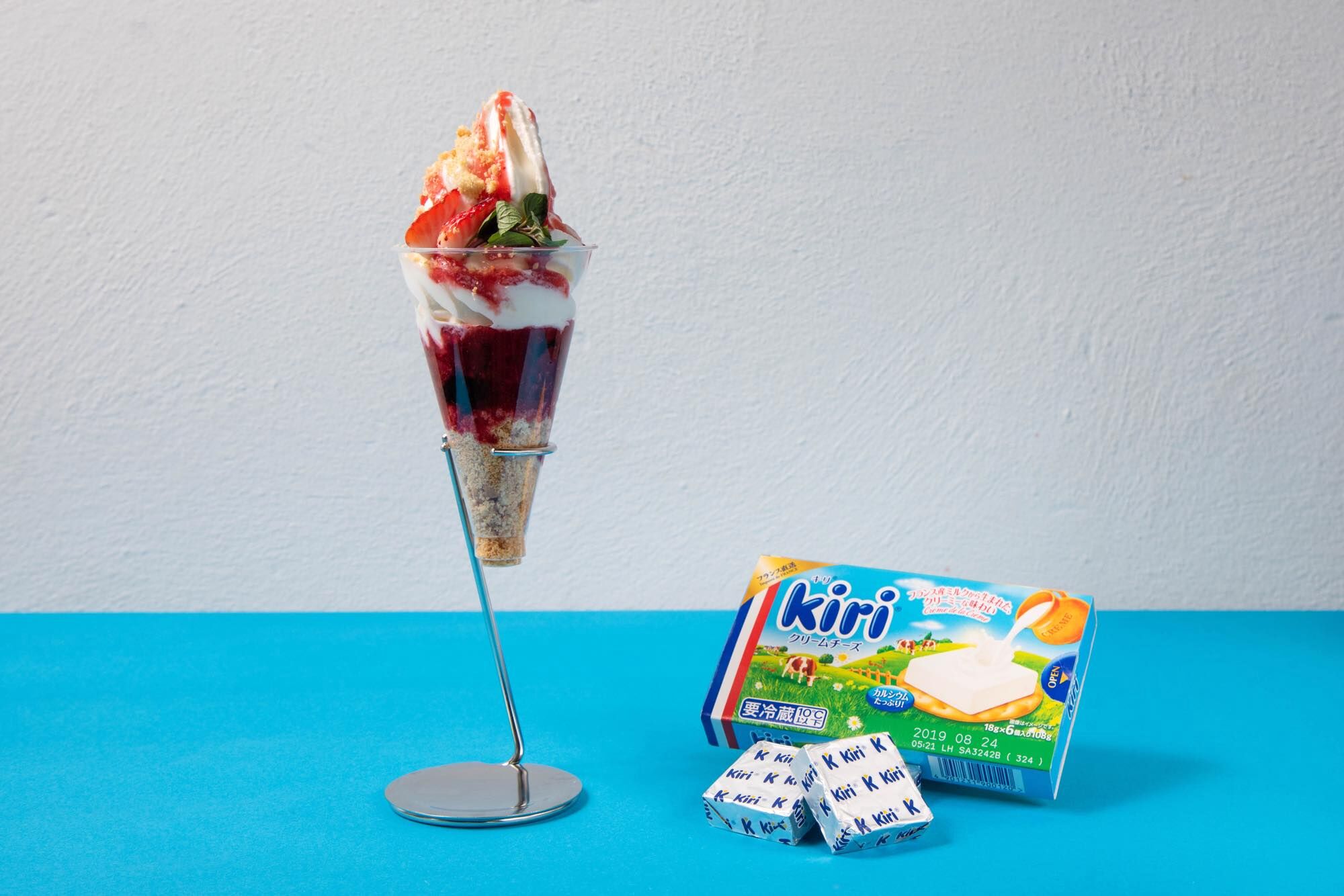 ストロベリーソースとサクサクのバタークッキー、濃厚な「キリ」のソフトクリームが層になった、テイクアウトとして食べ歩きにもおすすめの一品です。