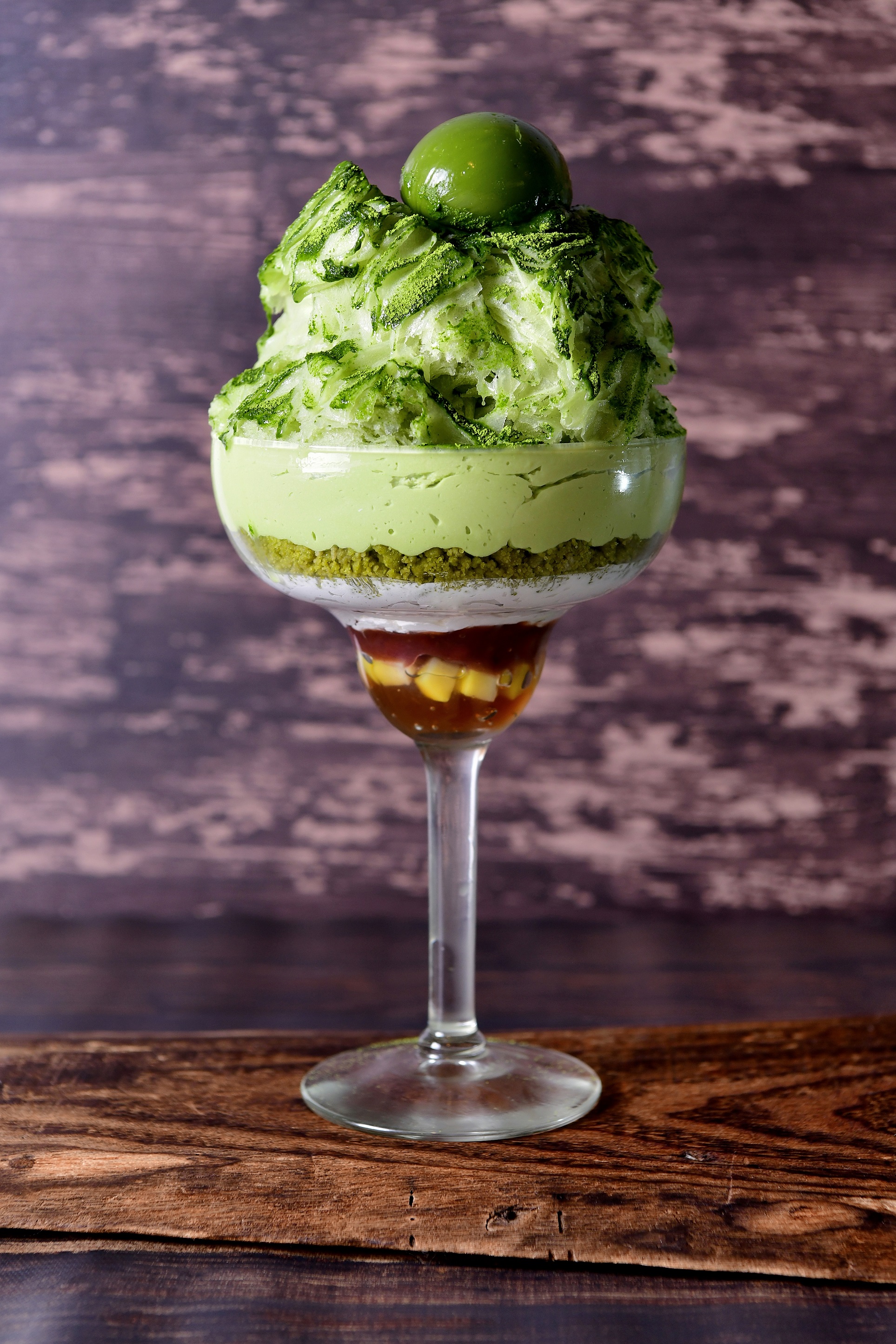 から優しく溶けていく、粉雪のような食感に仕上げています。パフェ仕様の器で、見た目も美しい大人なかき氷を目指しました。
