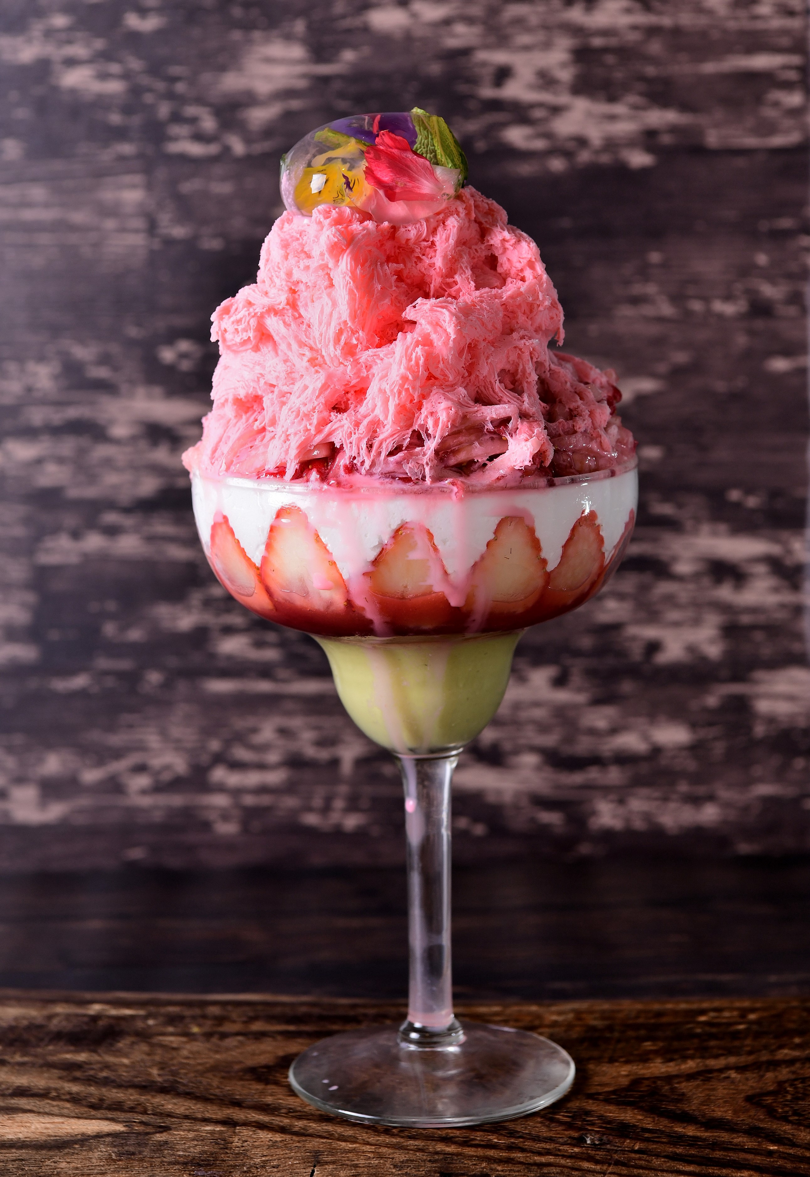 「〆パフェ」と「かき氷」を組み合わせた新メニューの「パフェスノー」。かき氷に使用する氷は、ミルク