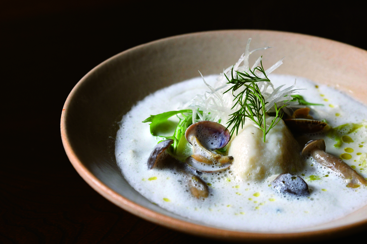 鯛だしをベースに、あさりの旨味とふわふわに泡立てたクリームスープが、