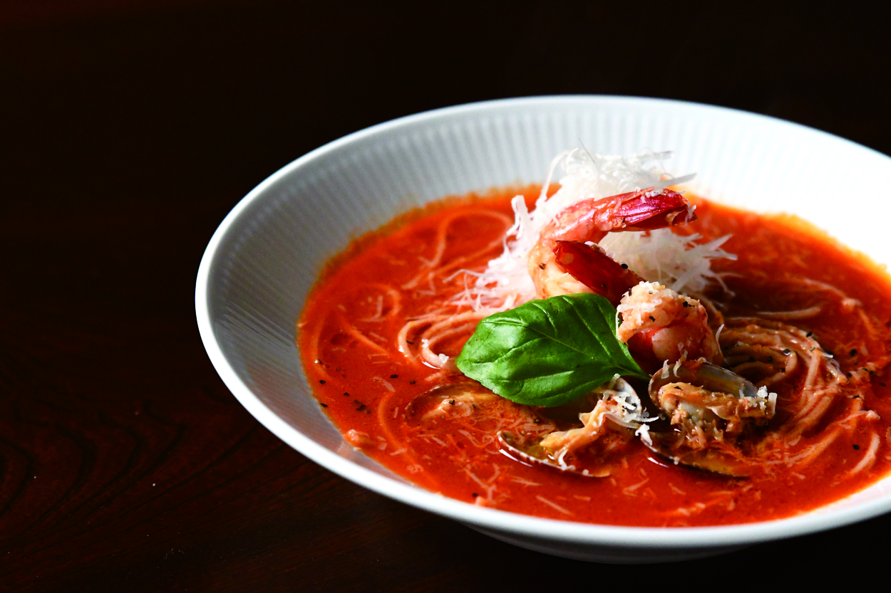 鯛だしをベースに、トマトとエビのうまみを凝縮させたスープが、太くて香ばしい全粒粉のそうめんとよく合います。