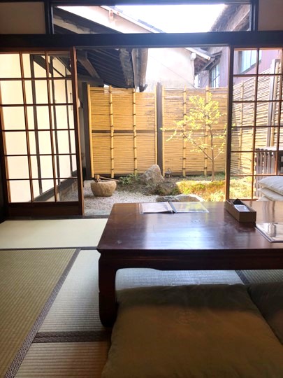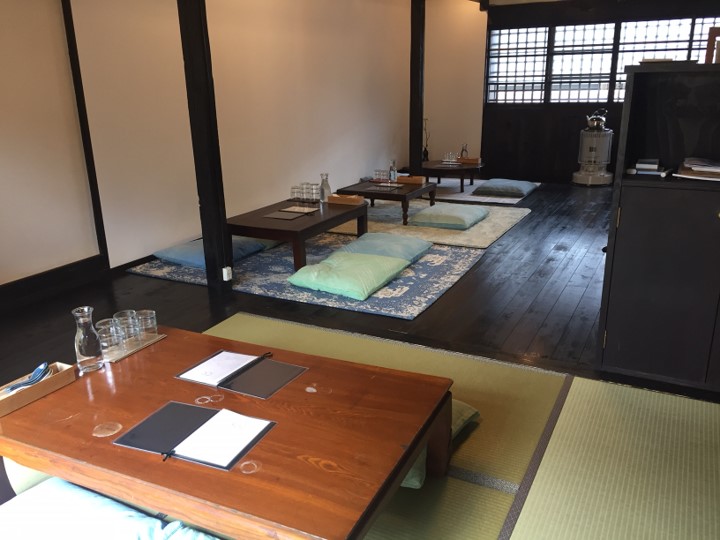 古い町家を改装した店舗で、外は格子の窓とロゴが入った白い大きな太鼓のれんが目印。店内はレトロなちゃぶ台が並び、小さな庭を臨む懐かしさを感じる落ち着いた空間です。