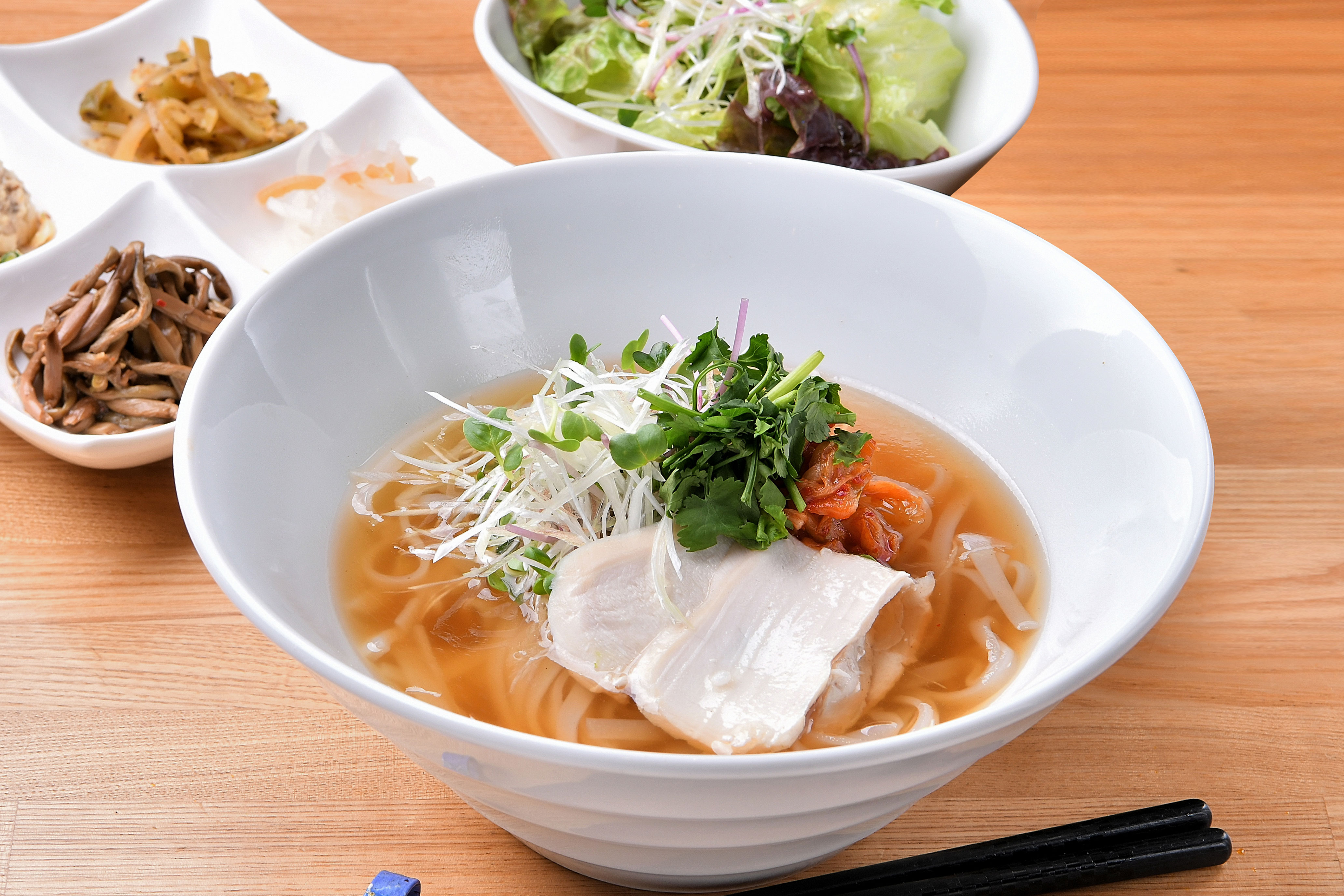 鶏メニュー以外にも、牛刺しやテールスープのほか、牛ハラミビビンバも用意し、牛メニューも用意。ランチメニューは、薬膳カレーやトッピングを選ぶことが出来るフォー、痺れ度合を選択できる麻婆焼きそばの3種類をスタンバイしております。