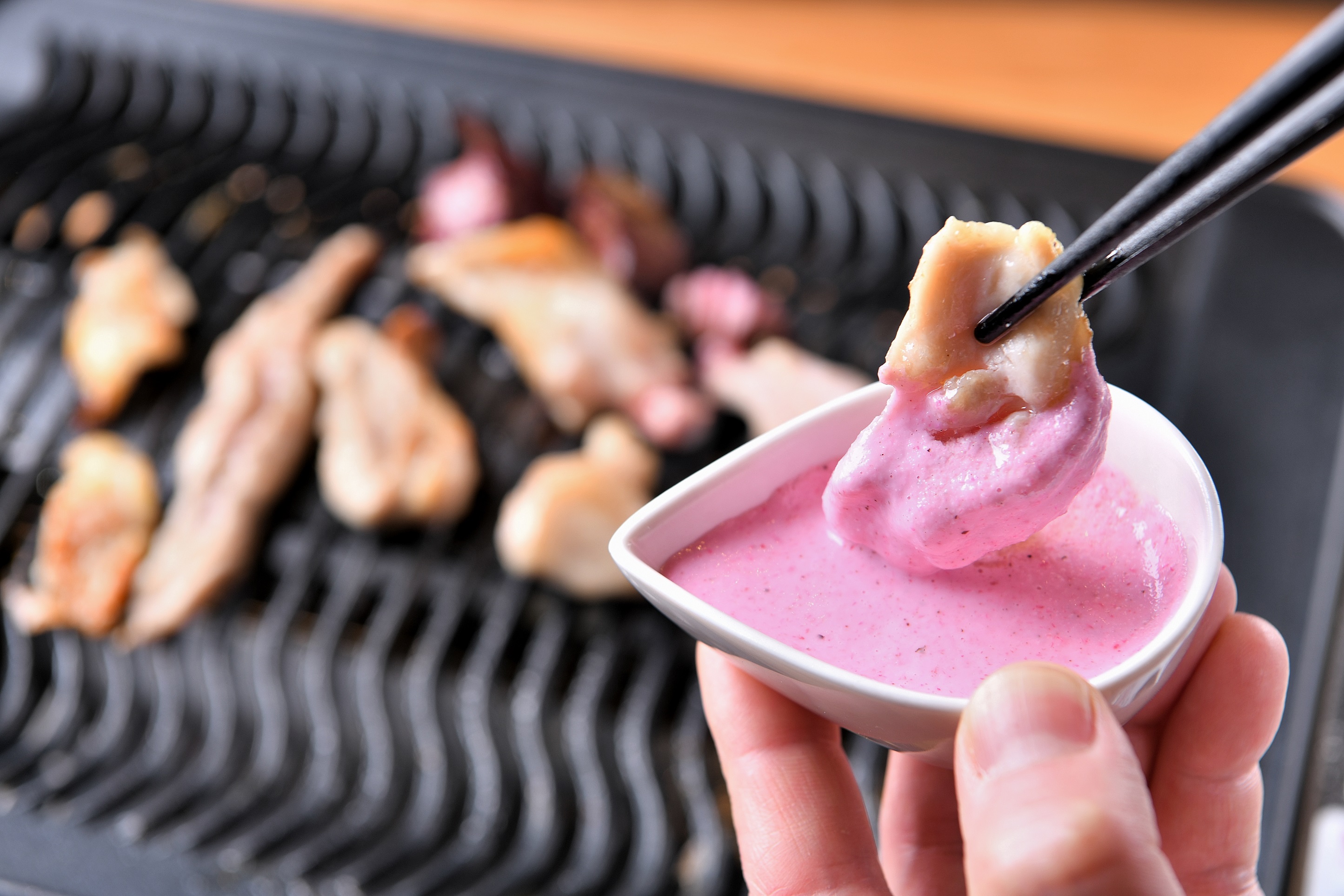 5月15日(水)にオープンする地鶏焼肉専門店「阿波尾鶏 地鶏焼肉専門店 痺鶏 時折り牛」。鶏肉は、甘味とコクがあり、適度な歯ごたえが特徴の徳島県産 阿波尾鶏を使います。目玉となる「鶏焼肉」は、11種の部位を揃え、トサカやセギモなどの希少な部位も今後置く予定です。鶏肉は、下味の揉みダレ4種類(プレーン・痺れ山椒・塩だれ・トマトバジル)からお好みの1種類を選択いただき、焼き上がった鶏肉は、5種類の漬けダレ(焼き鳥のタレ・パクチーポン酢・青唐辛子味噌ダレ・バジルソース・梅カツオにんにくのアイオリソース)で、飽きることなく、味変しながら楽しむことが出来ます。