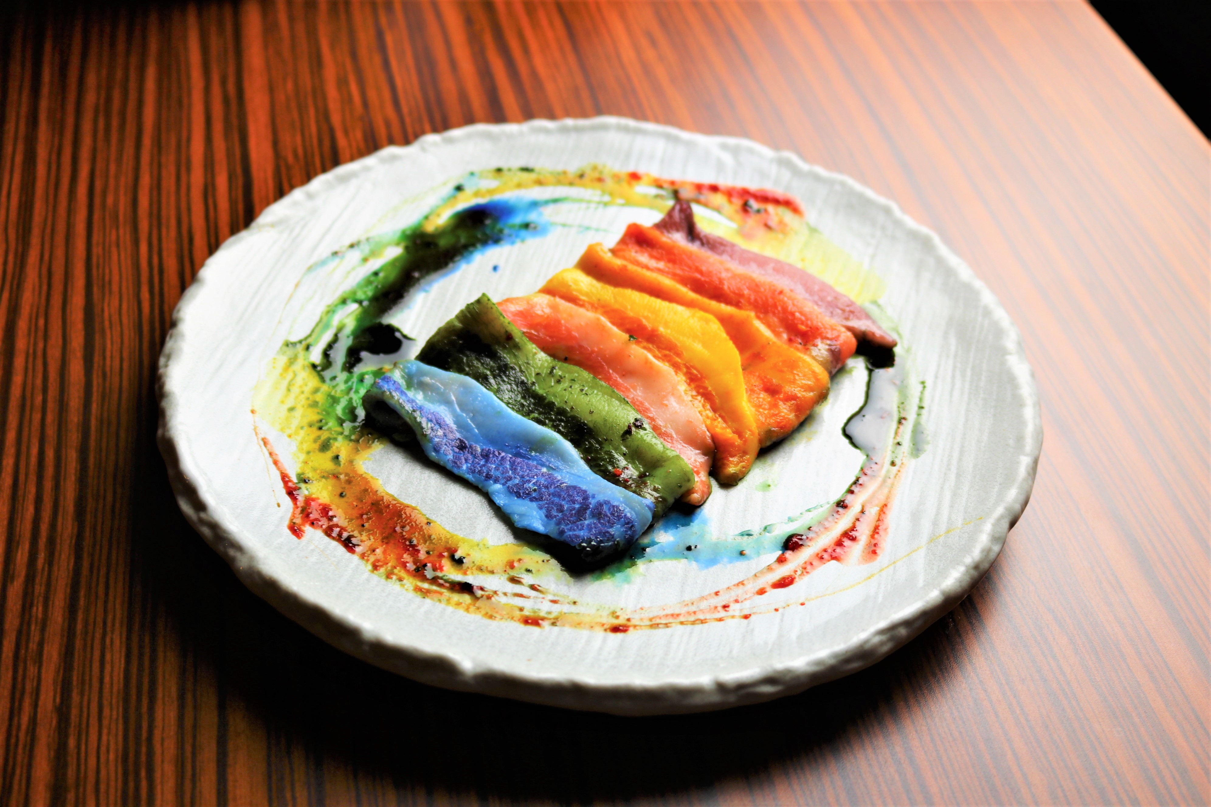 そこで当店ではホルモンに続く新たな展開として、肉のインスタ映えを追求した新メニュー「レインボー豚トロ」を開発しました。豚トロは焼いても着色が落ちにくい特徴があり、ホルモンよりも長い時間、色をお楽しみいただけます。色と味は、ピンク=明太子、黄=レモン、緑=バジル、オレンジ=カレー、青=ミント、紫=赤ワイン、赤=ピリ辛唐辛子の7種類です。新商品も、より多くのお客さまに見て、撮って、食べて楽しんでいただきたいと考えております。