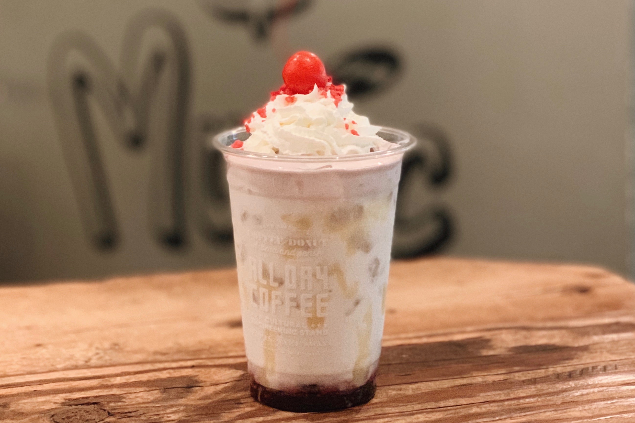 オリジナルのダークチェリーソースとホワイトチョコをミルクと混ぜながら楽しむ、懐かしいミルクセーキ。更にチェリーホイップとホイップクリームをトッピング。クランベリーのフリーズドライとさくらんぼがアクセント。