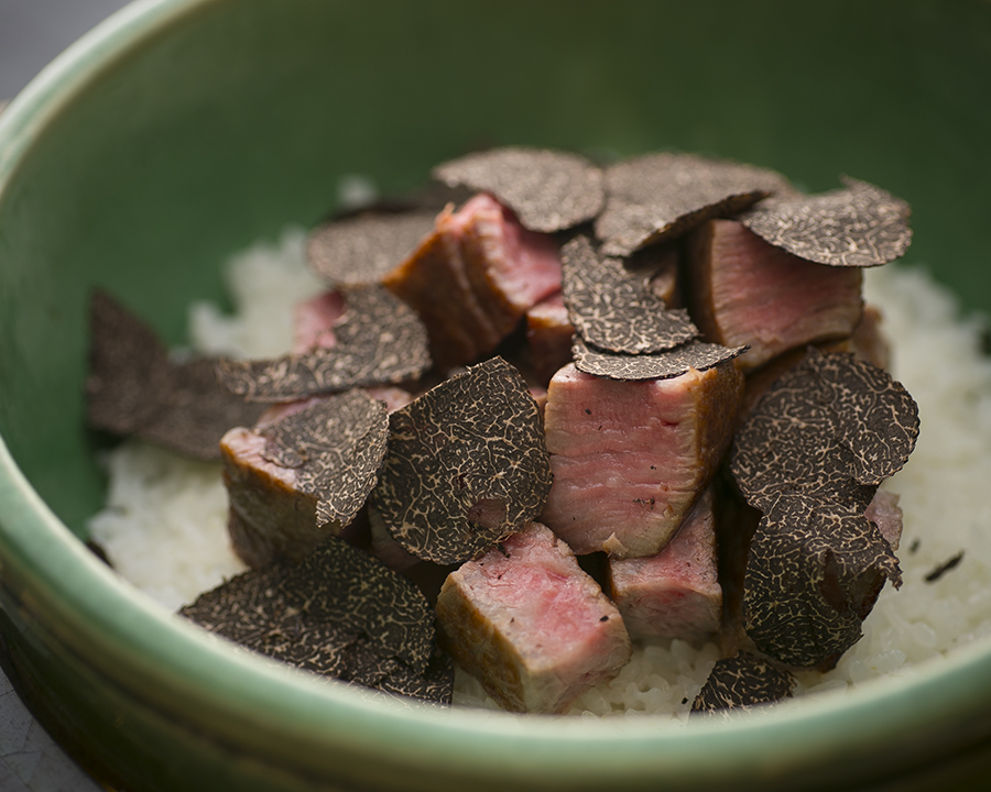 活け毛蟹のケジャン 海栗味噌添え(左)、シャトーブリアンと黒トリュフのビビンバ(右)