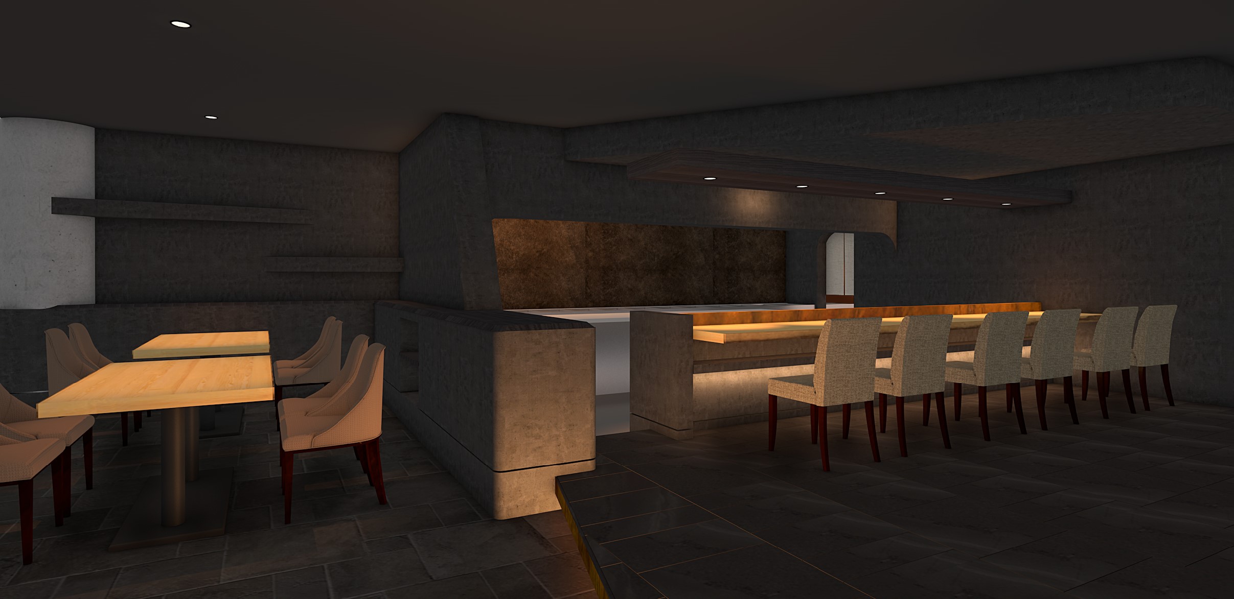当店は完全予約制で、フロアに到着すると予約者のみに伝えられる暗証番号を押してご入店いただきます。店内は、黒を基調に茶室をイメージした内装で、漆喰の壁面に白木のカウンターなど静寂を感じられる落ち着きのある空間となっております。