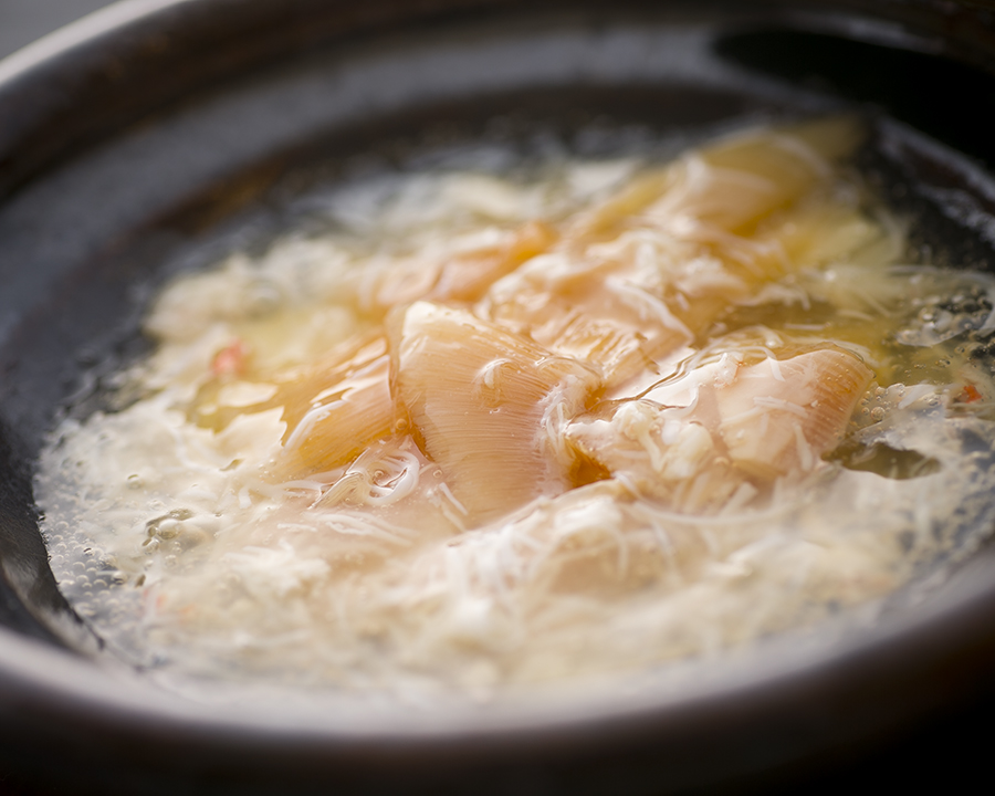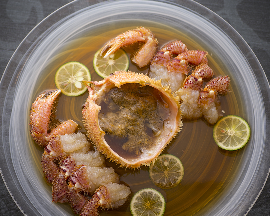 手掛けるのは、有名韓国料理店出身の関川シェフ。コース料理は、1万3,000円・1万8,000円(1人前、税サ別)の2種で、「毛蟹のケジャン」や「うにキムチ」、徳島県産黒鮑(くろあわび)とコンフィーした朝鮮人参のリゾットを合わせた「鮑のリゾット」、蒸しあげた毛蟹の餡をたっぷりとかけた「毛蟹のフカヒレステーキ」など、日本の高級食材をふんだんに使用し、素材を最大限に生かした料理をご用意いたします。韓国の定番料理である「ケジャン」は通常、一度冷凍したワタリガニを使用しますが、当店では活け伊勢海老や毛蟹、冬にはタグ付きの松葉ガニなどを使用しております。