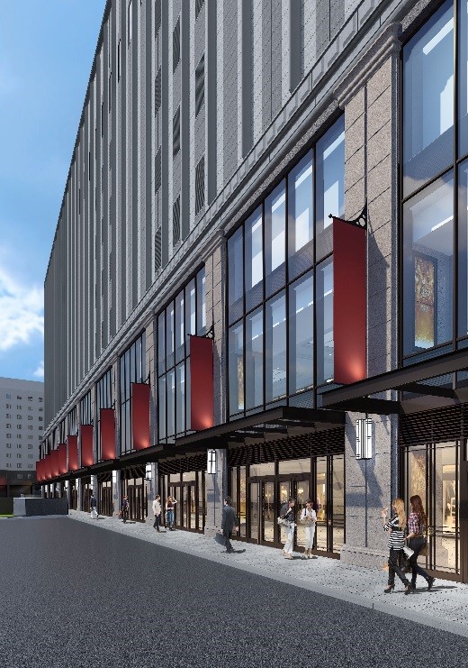 周辺の都市開発プロジェクトとの景観的な調和を図るため、壁面や屋上の一部を緑化するほか、グランドレベルでは開放感あるガラスカーテンウォールで、クラシカルでありながら先進性も感じられる建物デザインとします。中層部の外壁は、既存建物との統一感を重視し、インド産の天然石を使用しアクセントにリブを採用した重厚感ある石張りとなります。