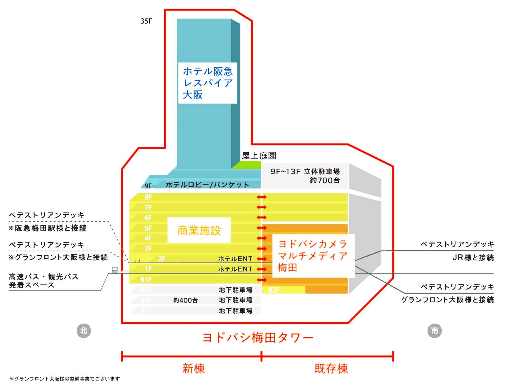 宿泊施設は、株式会社阪急阪神ホテルズが新たに立ち上げた宿泊主体型ホテルブランドの日本初の1号店となる「Hotel Hankyu RESPIRE OSAKA(ホテル阪急レスパイア大阪)」で、大阪市内でも最大級となる約1,000室の客室をご用意し、2019年11月27日(水)に開業することが決定いたしました。あわせてご宿泊と宴会場のご予約を2019年6月3日(月)より開始します。
