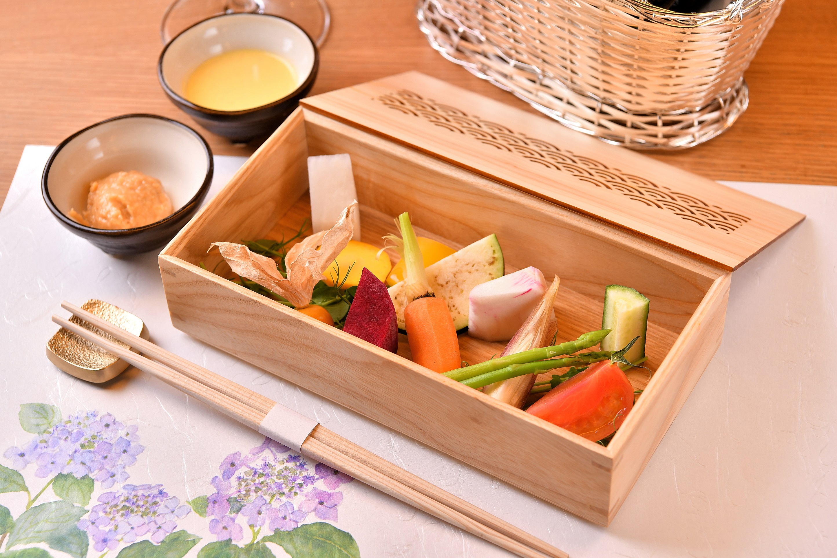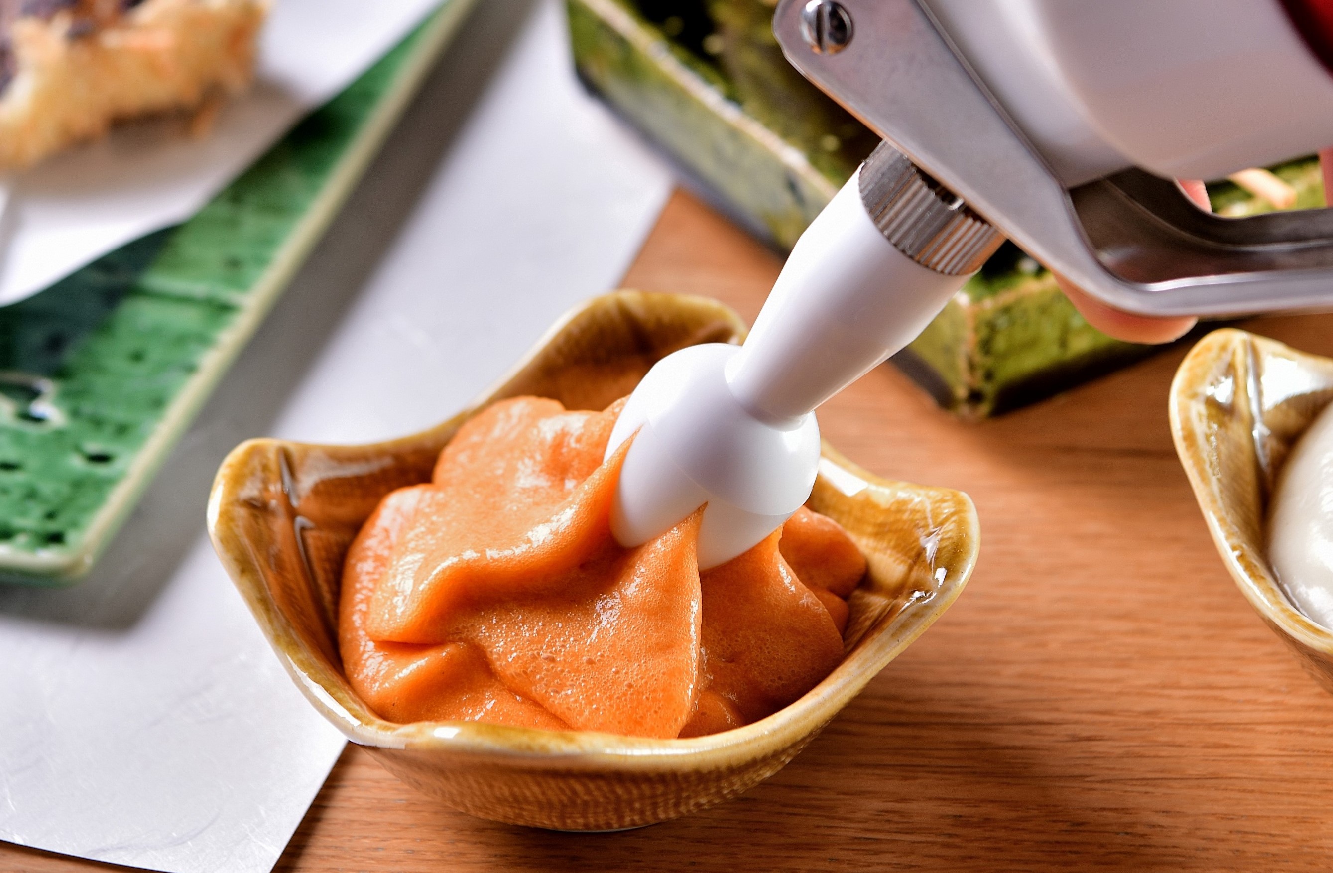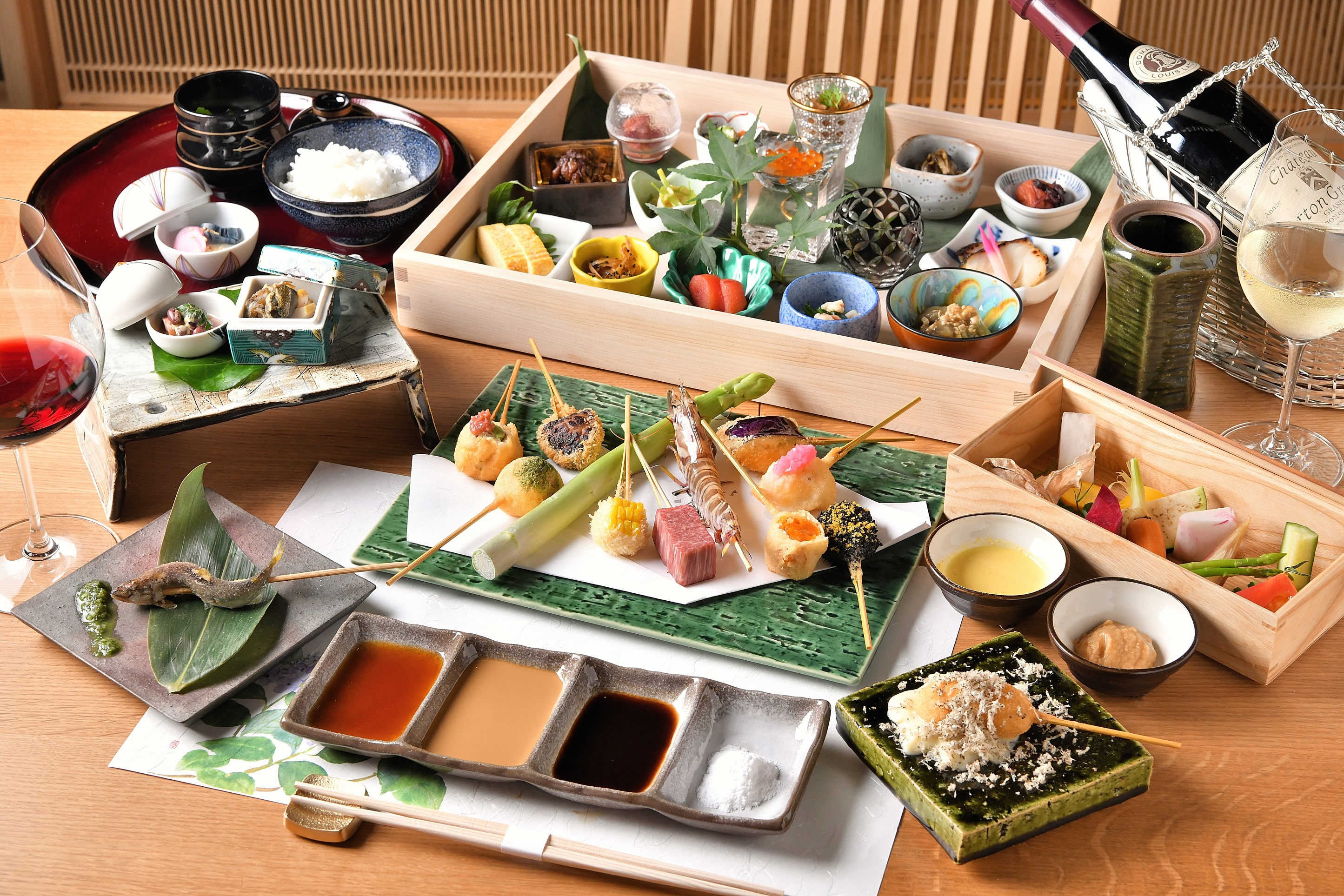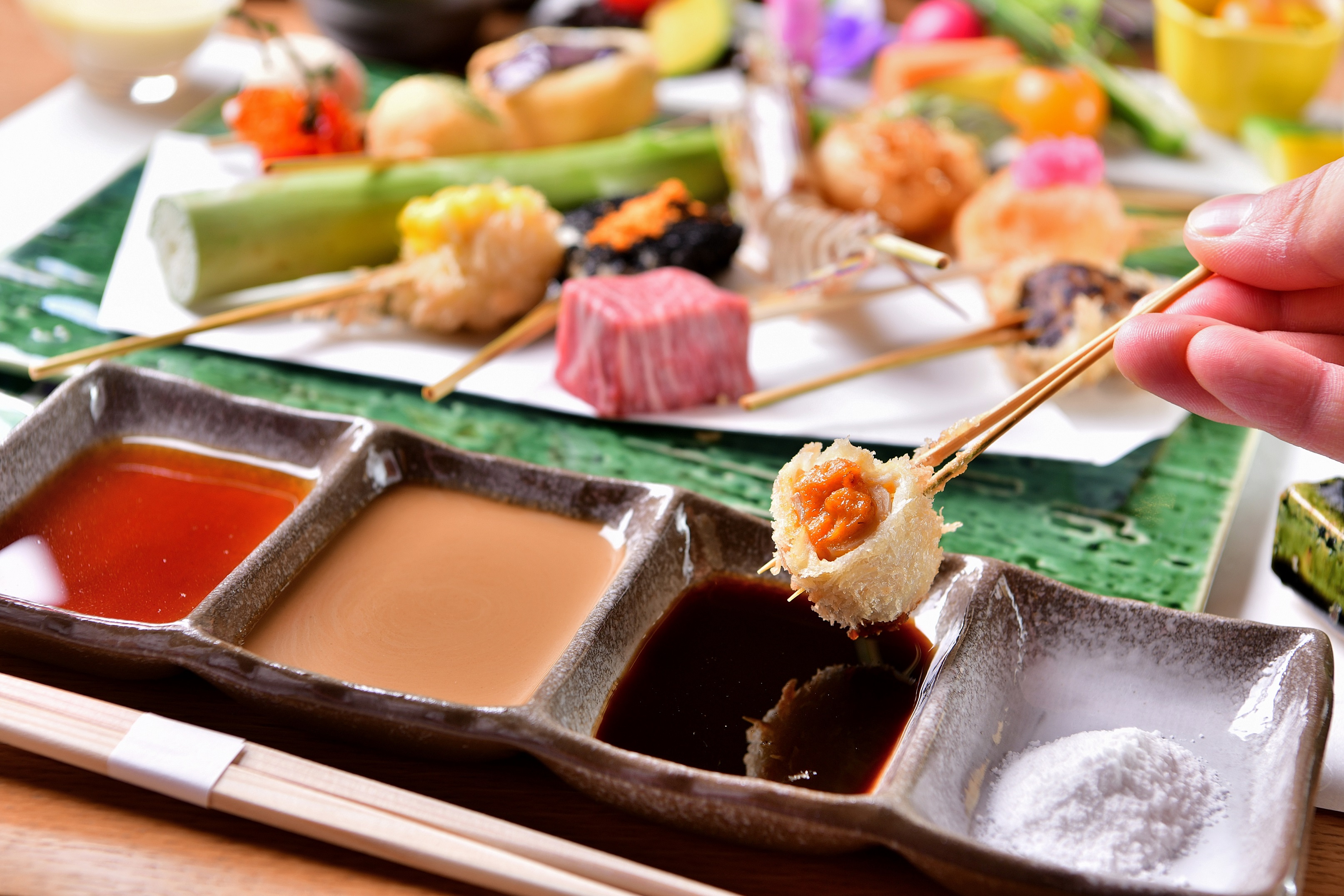 串揚げソースは、ぬちまーす・手仕込みの自家製ソース・からしソース・出汁醤油の全4種類を用意し、提供時におすすめのソースを提案します。11本以降は、隠れソース「エスプーマソース」を特別に提供いたします。「当店の品格を味覚だけでなく視覚でも味わって頂けたら」と、料理を彩る器には有田焼を採用。ドリンクは、ワインソムリエによるお酒の提案を是非お楽しみ頂ければと思います。