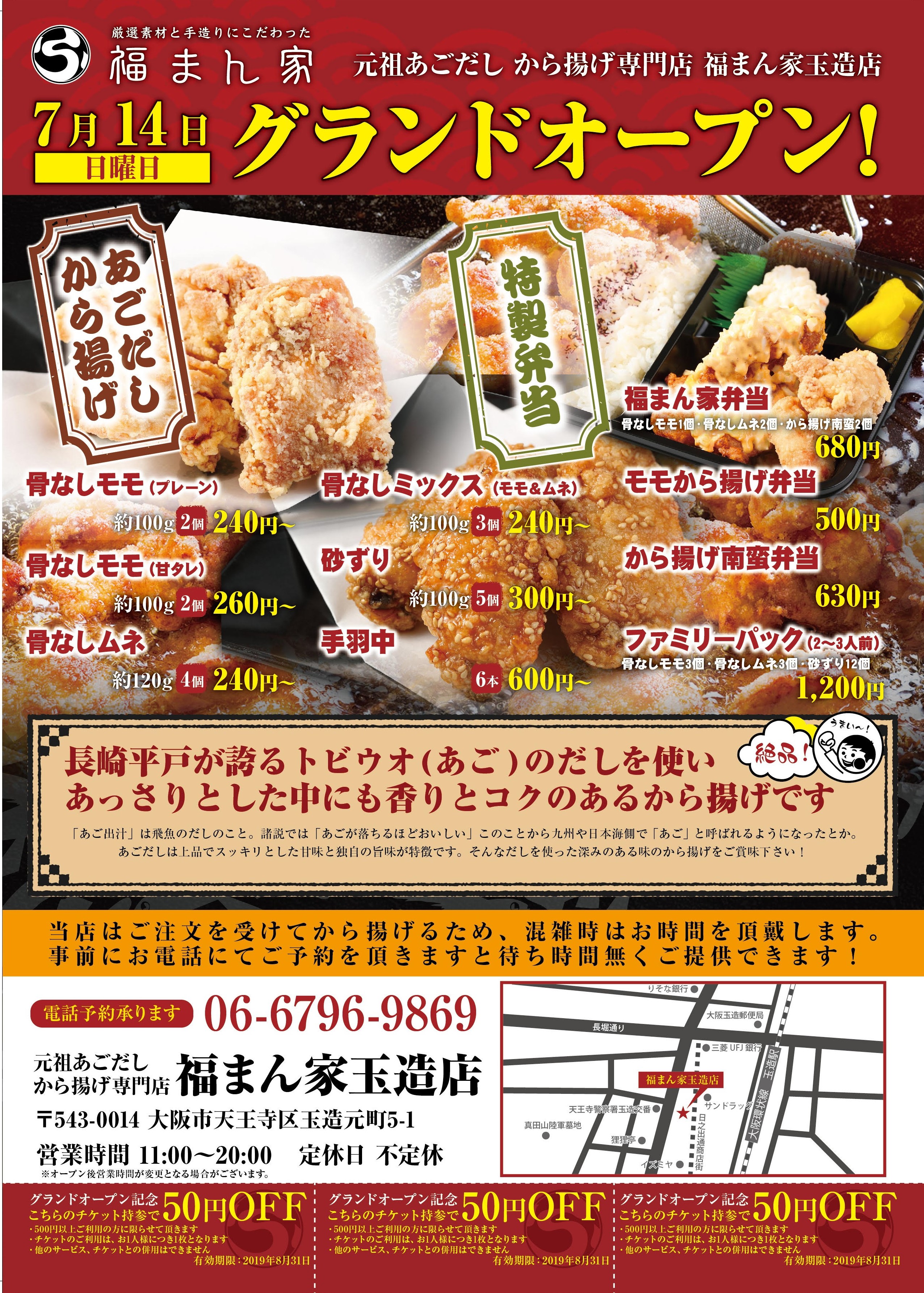 「元祖あごだし から揚げ専門店福まん家」関西1号店が7月14日(日)、玉造にオープンします。