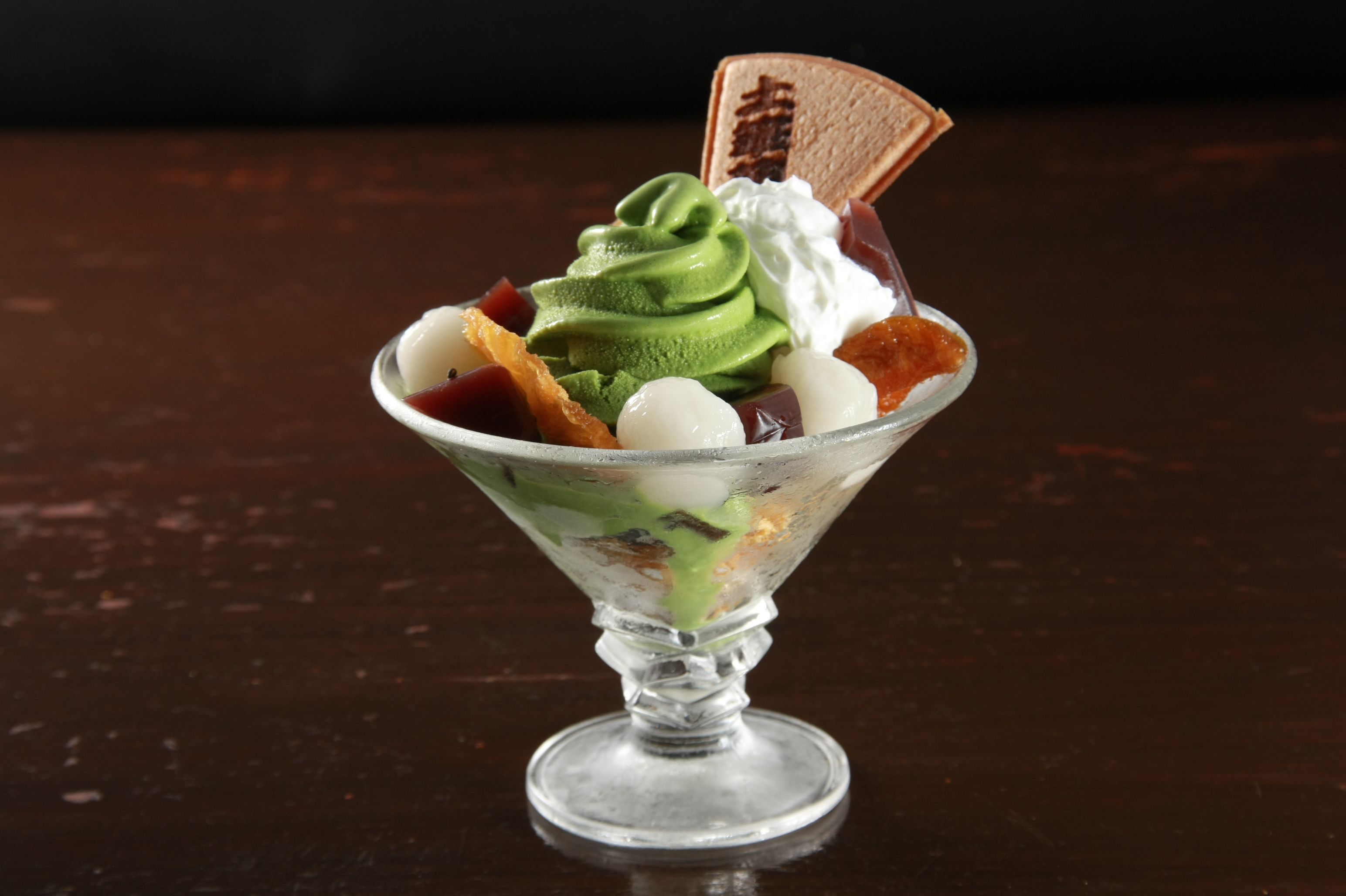 【白玉あんみつ】(131円) 「えいようかん」に抹茶アイス、白玉、ドライフルーツ、生クリームを添えました