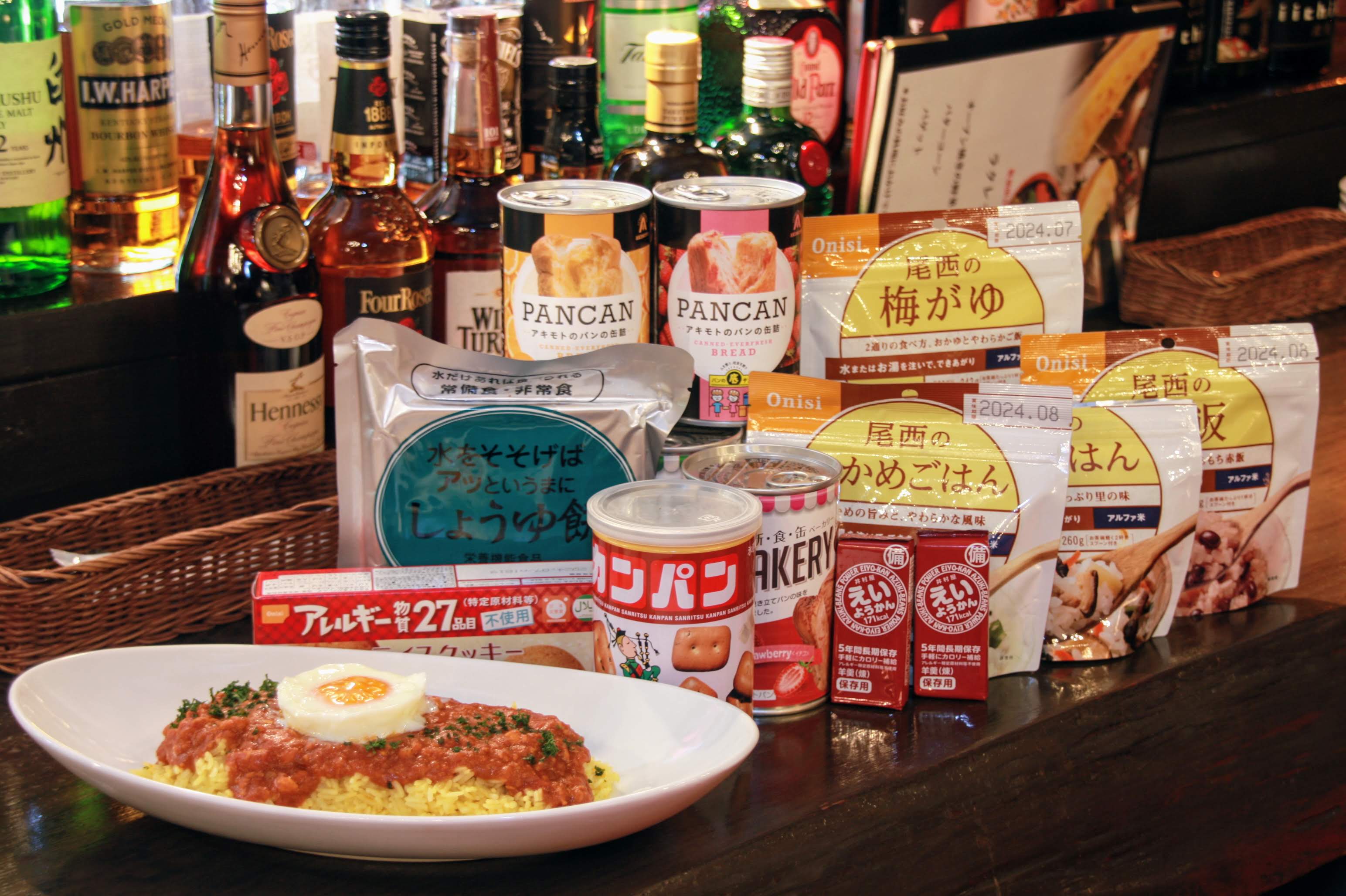 アレンジメニューには土筆苑の洋食メニューにないものもありますが、基本的に常時置いてある食材に、非常食をおりまぜて作りました。ちょっと非常食の背中を押す程度にして、あくまでもスタンダードな洋食になるように、創作料理にしないことを心がけました。非常食は「尾西のごはんシリーズ」「井村屋 えいようかん」などを使いました。「カンパン」はコーヒーとはちみつをしみ込ませて柔らかくし、缶底のゴマをかけてゴマアイスにしました。ここに挙げたメーカー・種類以外の非常食をお持ちいただいた場合でも、可能な限り洋食にアレンジしてご提供いたします。昨年は大阪北部地震や、西日本豪雨などの自然災害が相次ぎました。当店の「非常洋食」の取り組みを通じてさらに防災意識を高めていただけたらと考えております。